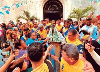 ver e contemplar a beleza da decoração feitas pelo Vando Nascimento, com rosas, orquídeas, lírios e flores tropicais, que embelezavam ainda mais a Berlinda. Além disso, promesseiros também já tinham iniciado seus trajetos, de joelhos, em direção a Basílica Santuário. Com o término do badalar dos sinos da