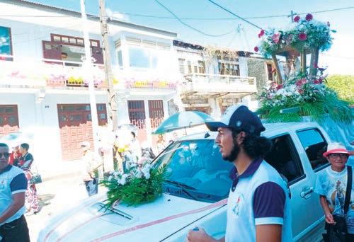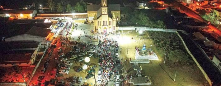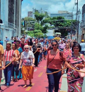 devotos se dirigindo pra Catedral de São Salvador. Mas, desde a da pandemia, para diminuir o percurso, ela percorre algumas ruas do entorno da Capela, voltando ao ponto inicial onde é realizada uma missa campal em frente à Paróquia.
