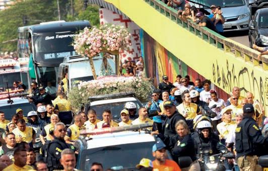Os promesseiros com os símbolos representando seus pedi dos e da sua fé por tê-las alcançadas, coloriram o trajeto de 3,7 quilômetros da procissão – casinhas, objetos de cera, livros e tantas outras expressões das graças alcançadas por interces são da Mãe de Jesus. Frente a Estação das Docas, foi montado o palanque das autoridades. Lá entre as autoridades estavam o governador Helder Barbalho e a esposa, Daniela Barbalho, além da vice-governadora, Hana Ghassan, e do ministro das Cidades, Jader Filho, outras autoridades, familiares e convida dos especiais. Daí o governador e seus familiares seguiram a caminhada de fé, junto a multidão.