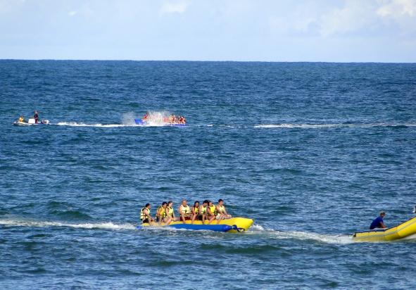 Entre as três pedras, também estão presentes atividades como o passeio de banana boat e quadras para a prática de vôlei e futevôlei.