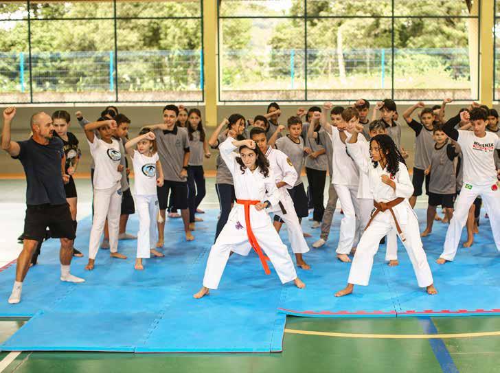 Durante as aulas de Educação Física da professora Myllena May, os estudantes do oitavo e nono anos se aprofundaram nas práticas corporais de aventura na natureza. Durante os encontros, os alunos foram divididos em grupos, momento em que cada equipe representou uma modalidade, como escalada, surfe e corrida. A ideia era estudar o esporte e apresentá-los para os colegas.