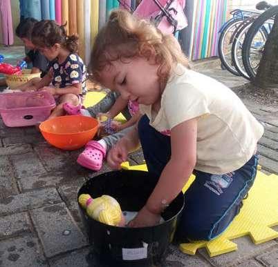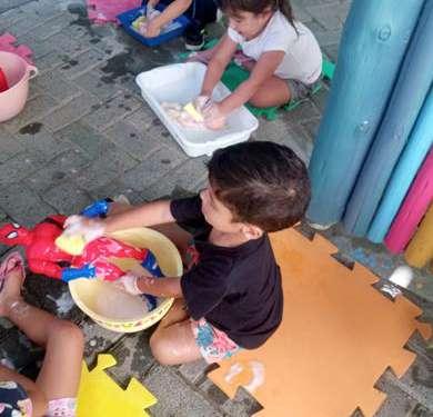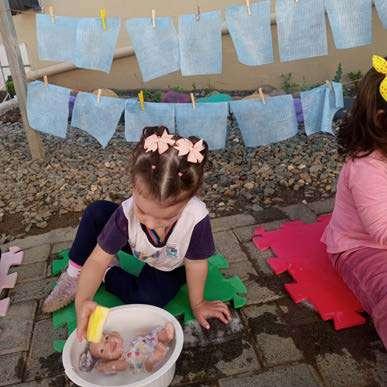 Para ensinar sobre os cuidados com a higiene pessoal e, ao mesmo tempo, estimular a criatividade e a coordenação motora das crianças, a professora Letícia Flor, junto com a monitora Francieli Bauer e o agente Erik Silva, desenvolveu uma atividade diferente: dar banho em bonecas. Os pequenos utilizaram bacias de água, esponjas, toalhas e “limparam” e secaram as bonecas — a experiência também foi uma maneira de desenvolver a autonomia e a independência das crianças.