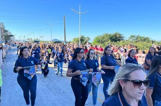 Traduzir, em algumas horas, o sentimento pela terra onde nascemos e crescemos ou que escolhemos para viver é um desafio. Como representar aquilo que sentimos e todas as emoções e experiências que já vivenciamos em um lugar? Essa provocação marca uma tradição antiga de Navegantes: o desfile da educação. Marcado para acontecer na festa de aniversário da cidade, é neste momento que as escolas levam à avenida o amor pelo município. O costume, comum para todo navegantino, é um hábito que acompanhou e acompanha outras gerações, principalmente aquelas que viram a emancipação da cidade — há quem tenha participado da celebração como professor e agora acompanha a unidade como diretor. Exemplo disso é o tributo feito pela Escola Municipal Professora Idília Machado Ferreira, que trouxe para o público a história da própria escola, colocando junto com os estudantes aquelas que já estiveram à frente da sala de aula, como Luíza Guarezi, Zenilda Cândido, Marli Bortolatto Guarezi, Raquele Pagani — primeira merendeira da unidade — e Maria das Neves Emílio Machado, profissional que deu nome a uma das unidades escolares de Navegantes. No encontro entre o passado e o futuro, a comunidade acompanhou aquilo que aconteceu em cada turma. “Estamos nos preparando há mais de quatro meses. Este ano, pensamos em mostrar aquilo que as escolas fazem de melhor. Por isso, professores e alunos levaram para a avenida um pouco da identidade de cada escola. A educação faz parte da história do município”, conta a secretária de educação de Navegantes, Patricia Duarte Cidral.