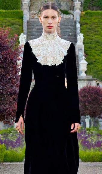 La colección rinde homenaje a la legendaria colección blanca de Valentino Garavani de 1968, en donde elementos como sombreros turbante, hilos de perlas y detalles de piel se entrelazan hábilmente con la estética kitsch-chic.