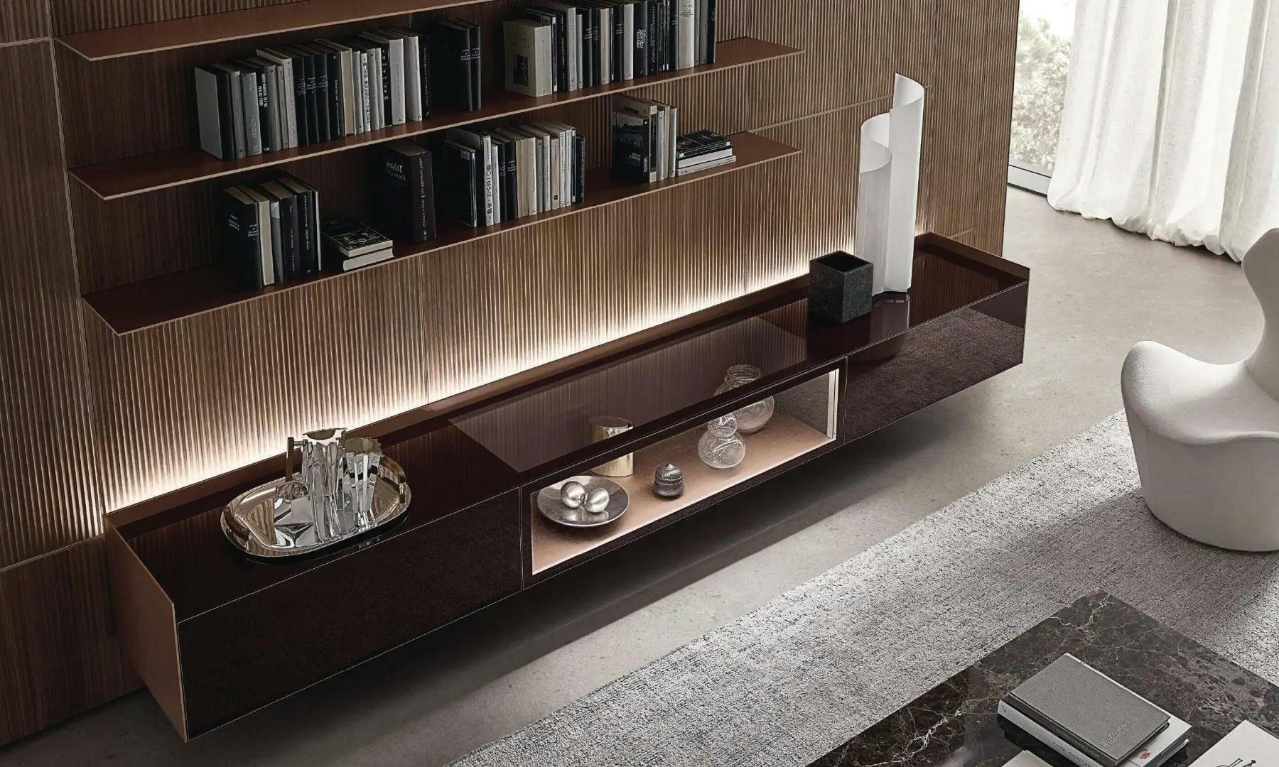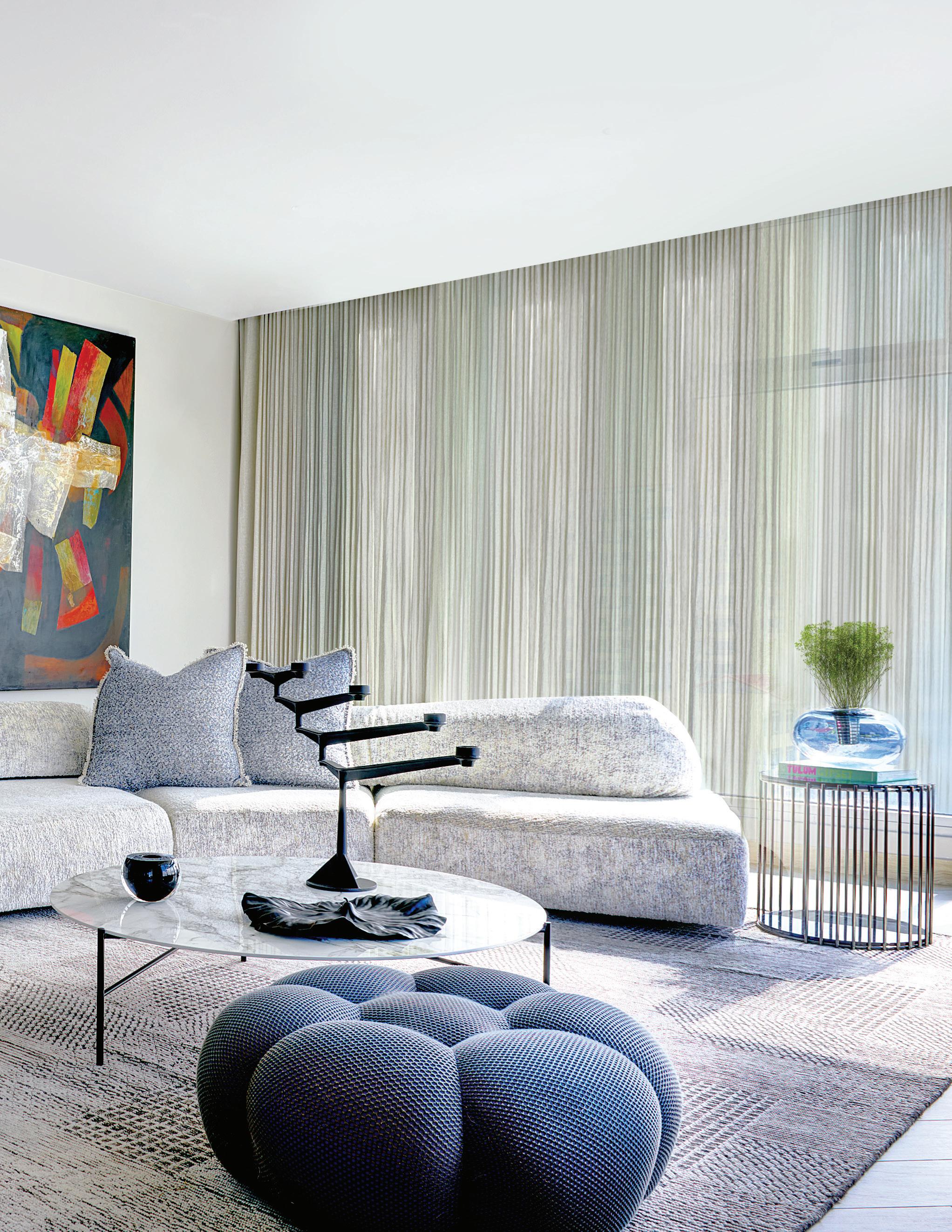 Al lado de la sala, un espectacular mueble flotante del diseñador Jorge Pardo conforma una composición creada con butacas giratorias (Lignet Roset) que invitan a la relajación y fomentan el diálogo. Hay serenidad y armonía en la ubicación de los elementos. La integración de muebles, accesorios y acabados resulta en una composición original donde todo fluye.