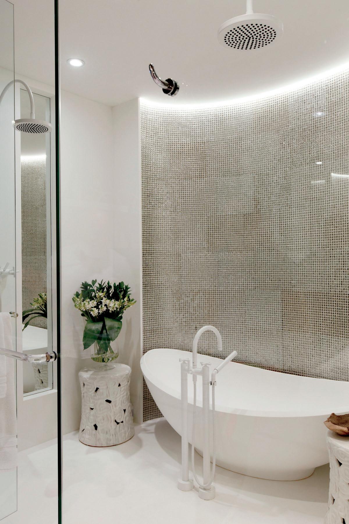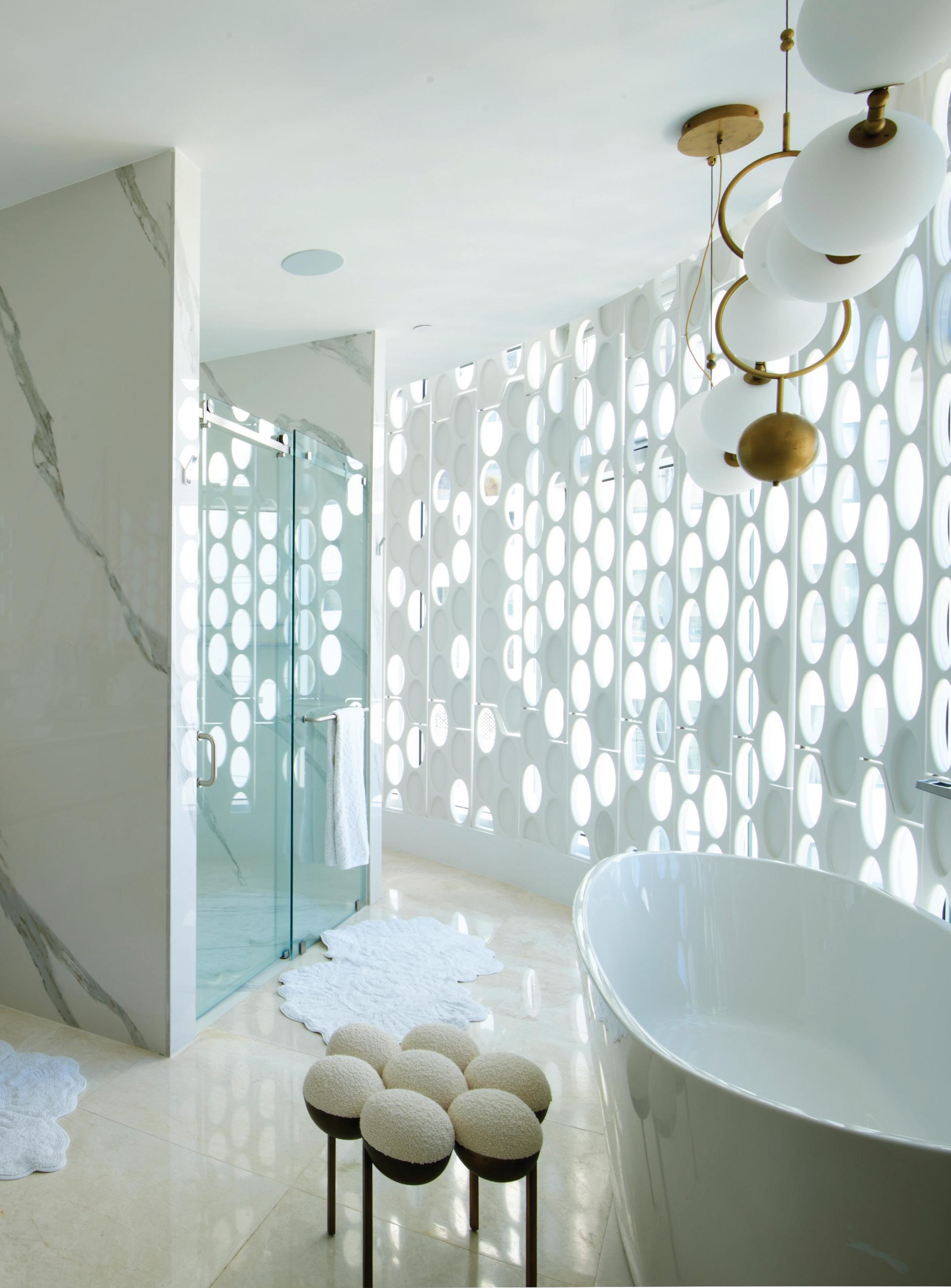Al filtrarse por los paneles de los ventanales, la luz natural crea interesantes patrones de destellos en el baño principal.