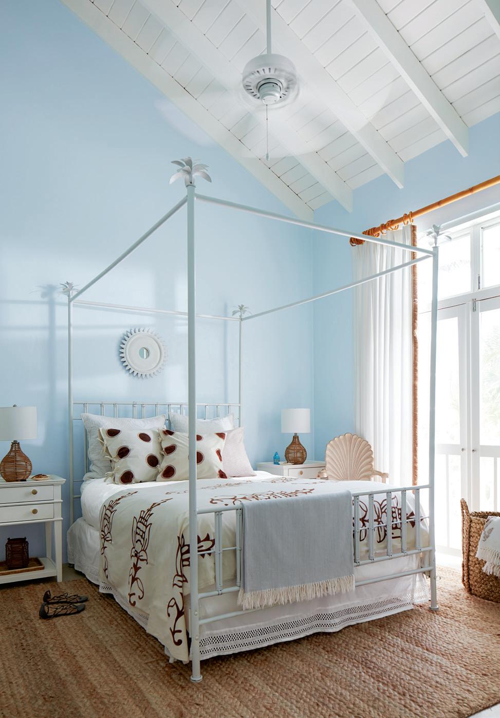 En el dormitorio matrimonial un papel decorativo en tonos azules y blancos nos hace sentir que estamos flotando sobre el mar, el cual se puede disfrutar desde esta cómoda habitación que dispone de su propia terraza. Mientras que en su baño ensuite, la lámpara Coco Chanel y el biombo diseñado a la medida del espacio, son las pièce de résistance.