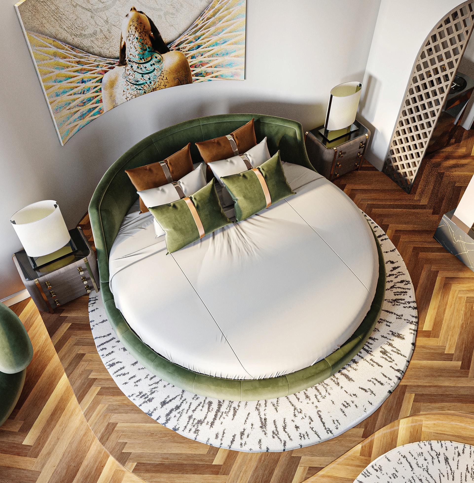 El sofá cama y el sillón Zelda, diseño de Studiopepe para Essential Home, son en tonos verdes y sus formas redondeadas actúan maravillosamente en este prestigioso espacio de paleta natural y tierra. Realzando la hebra de lujo del dormitorio, la silla de comedor Perry y la mesita de noche Kahn son una excelente adición a la ya extremadamente maravillosa habitación. Esta creativa diseñadora, llena de ideas originales y modernas, gusta de diseñar espacios elegantes y funcionales, siempre buscando superar las expectativas de sus clientes en todos sus proyectos.