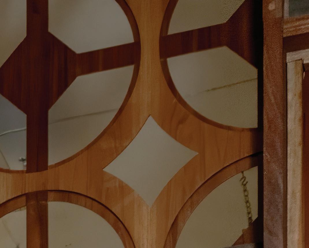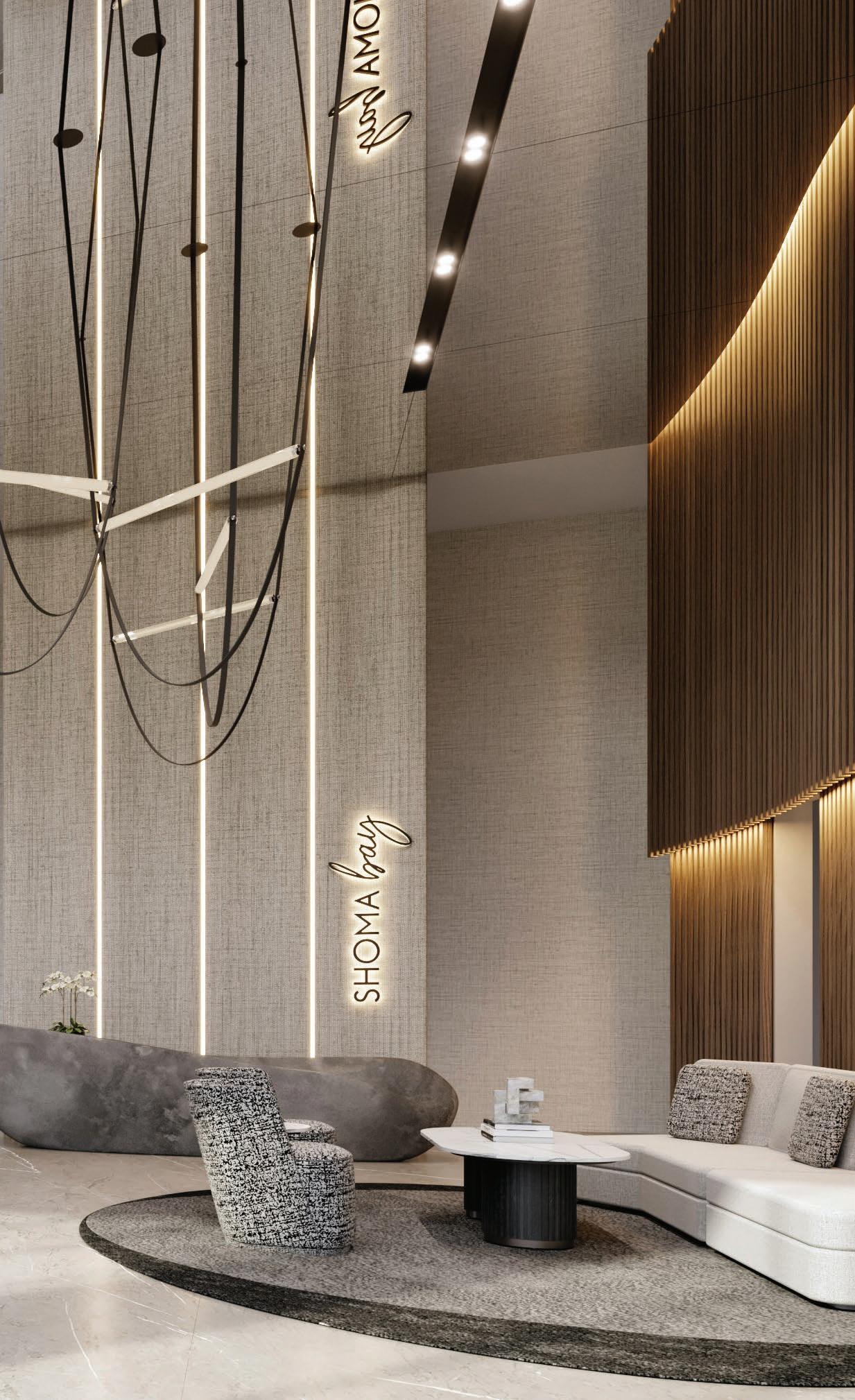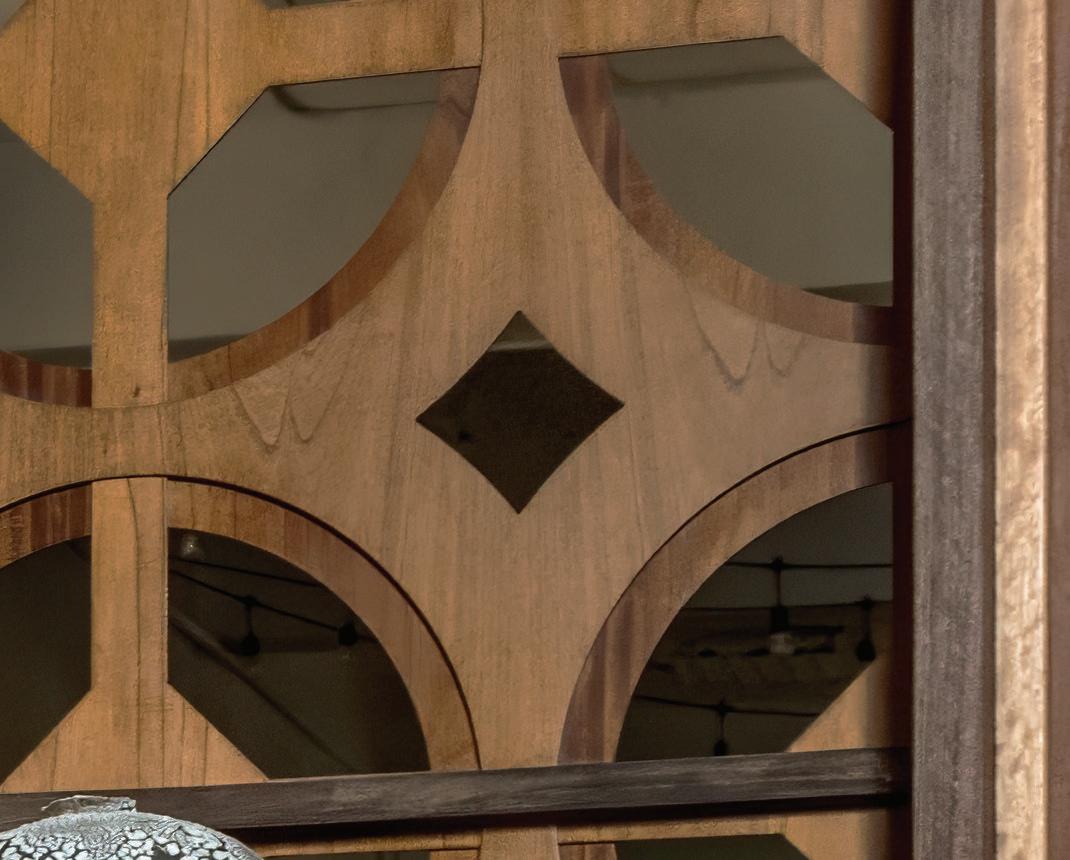 El salón principal se organiza con un lenguaje de simetrías y ejes visuales que generan armonía, este brilla con un juego de contrastes: tonos claros y cálidos, mobiliario de madera y acentos de color en tapicería roja. Las luminarias colgantes, de diseño orgánico y escultórico, evocan burbujas de champagne, en diálogo con el patrón de piso.