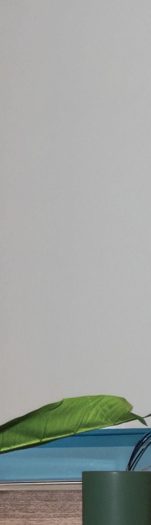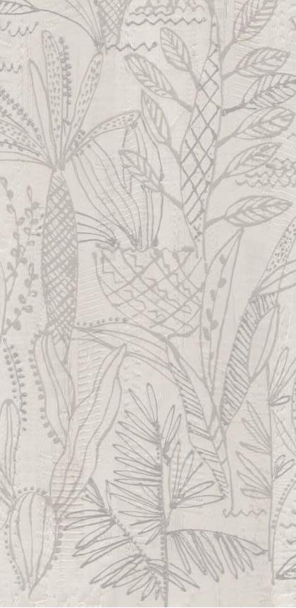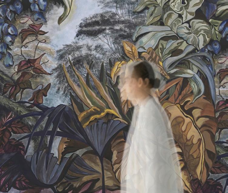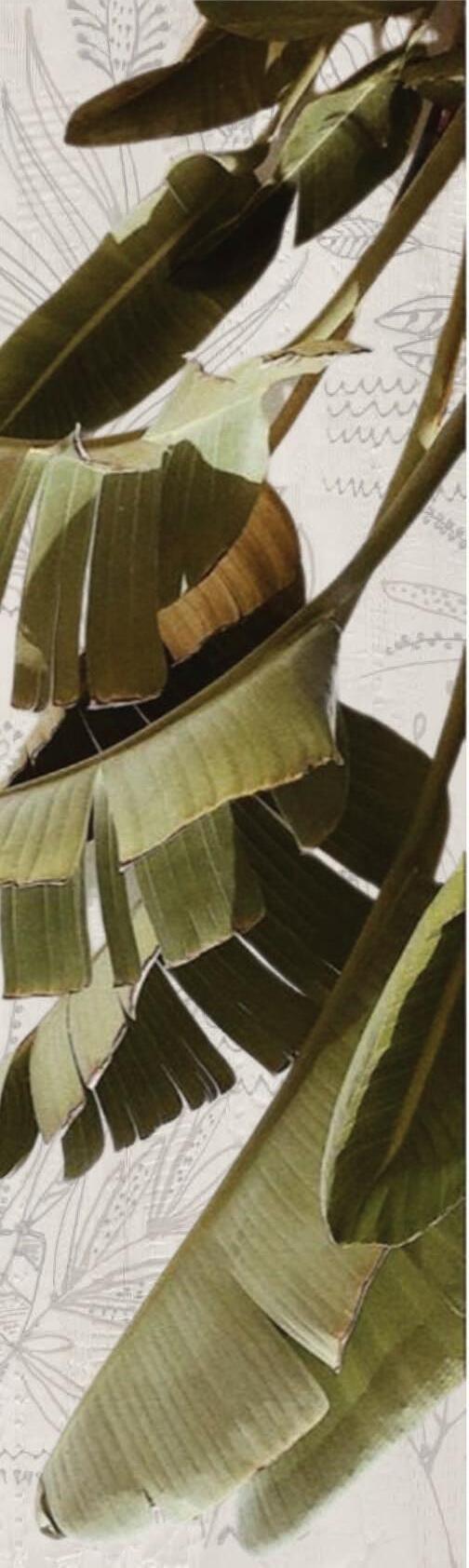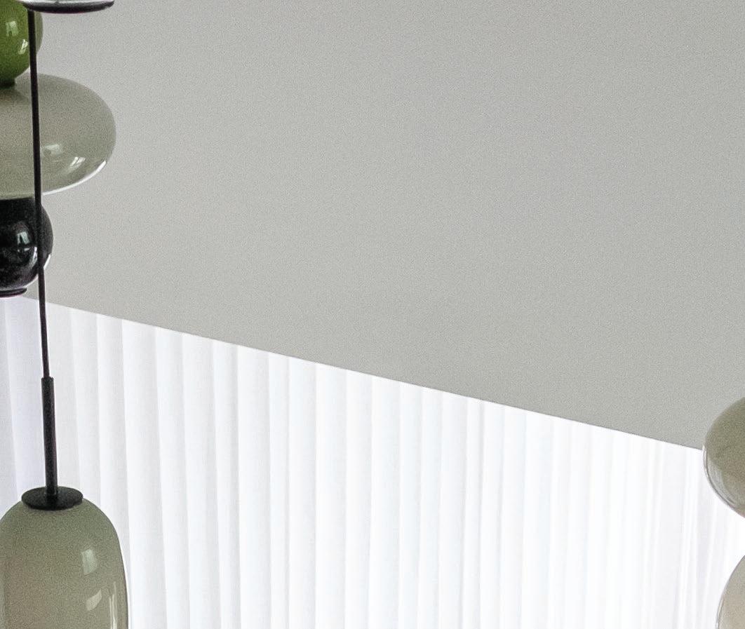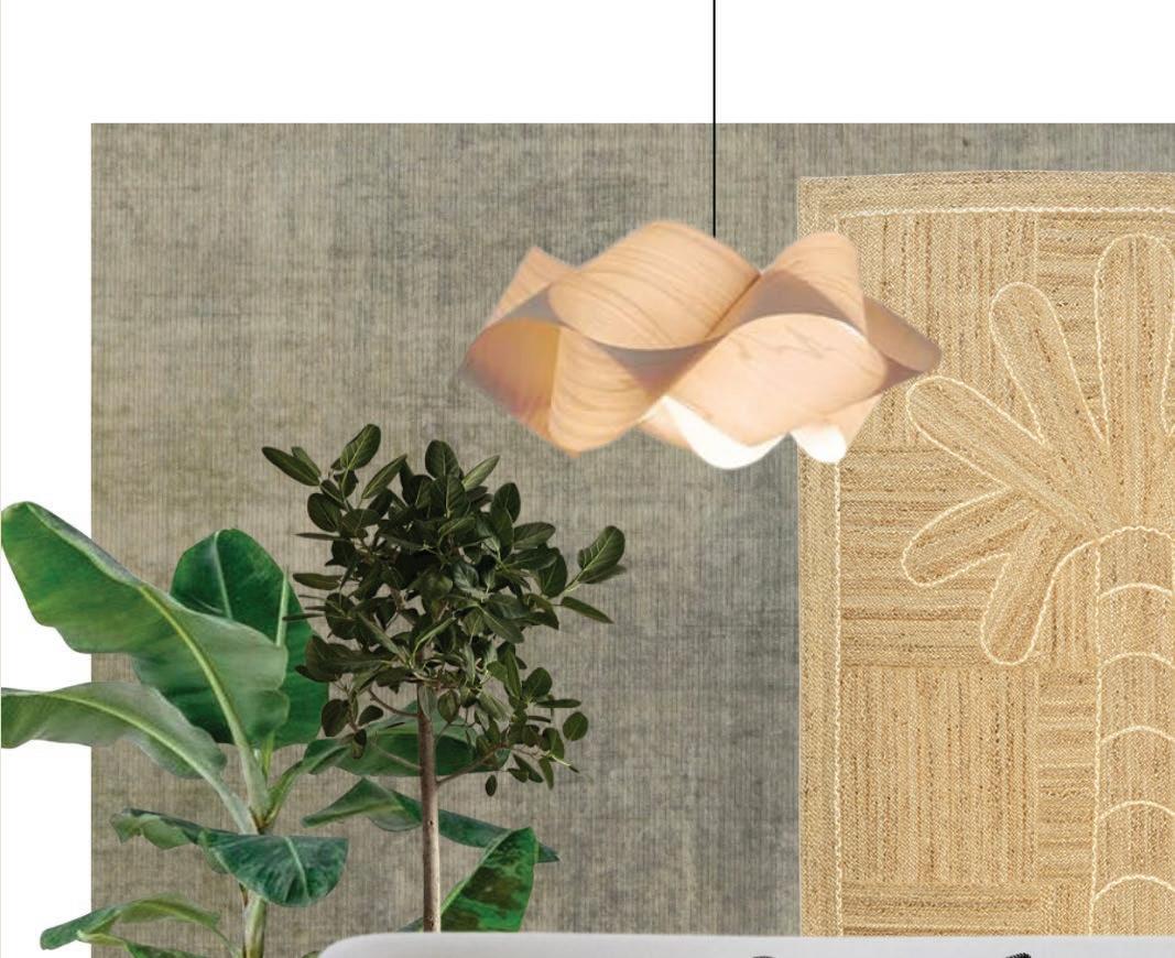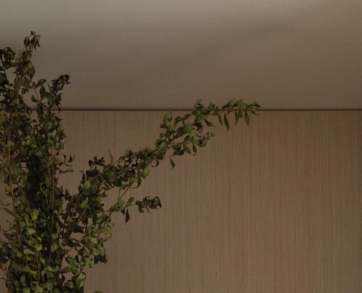 De proporciones generosas y tonos verdes y blancos, flotan a distintas alturas, mientras un papel decorativo de hojas enfatiza la altura de las paredes.