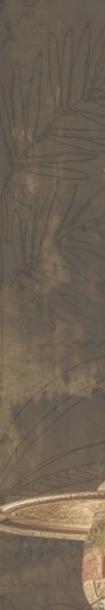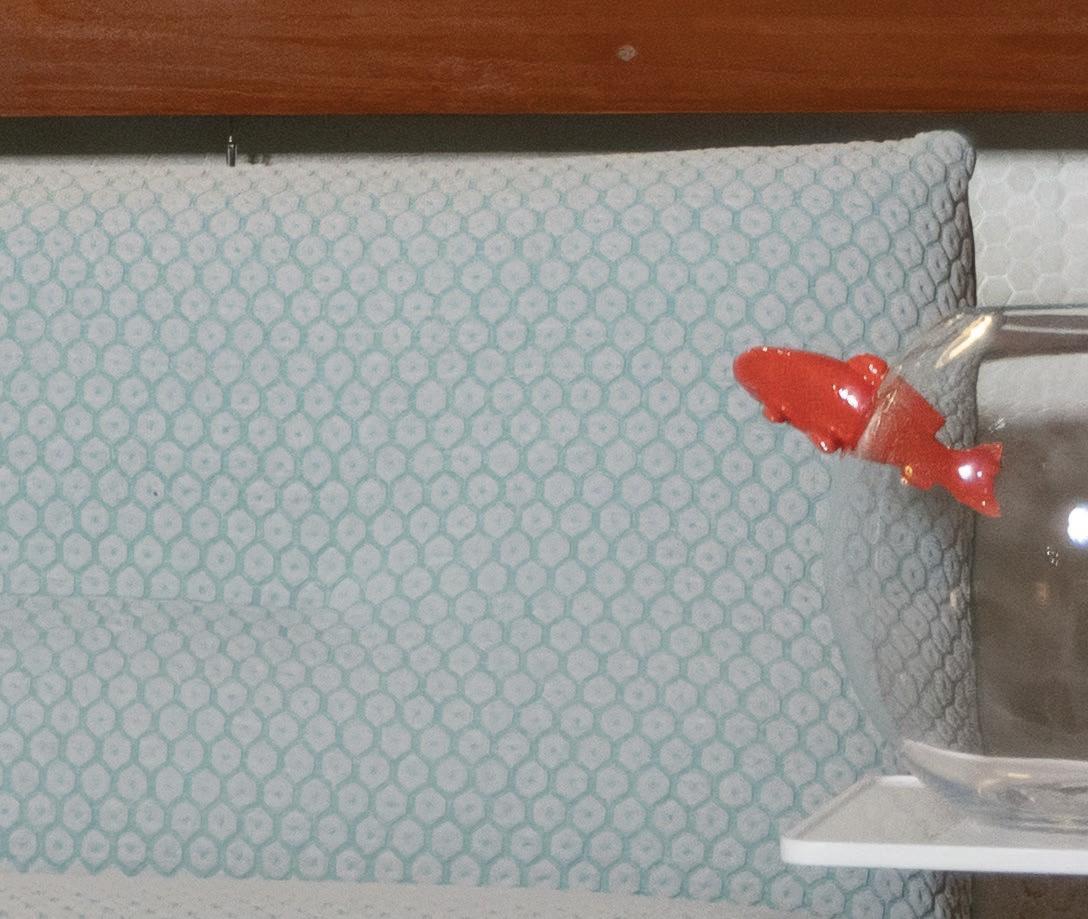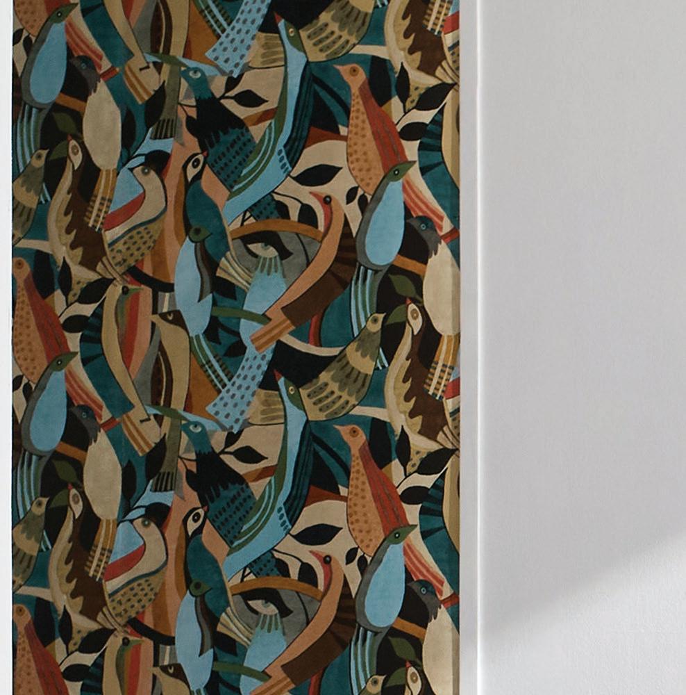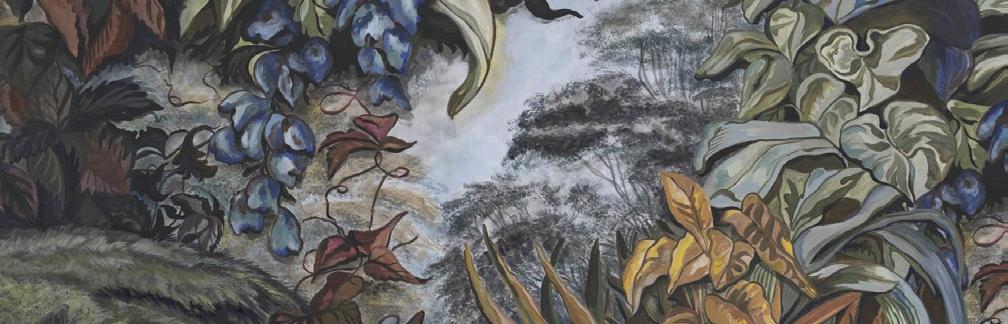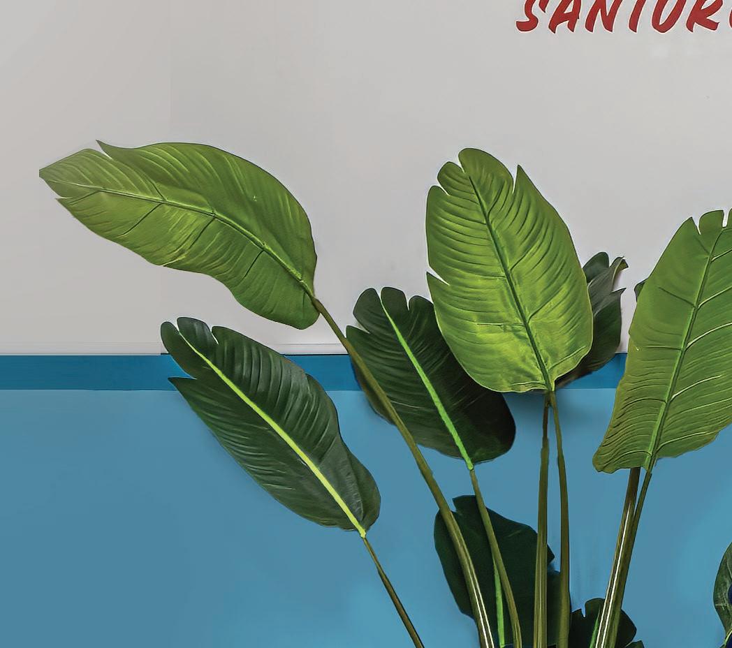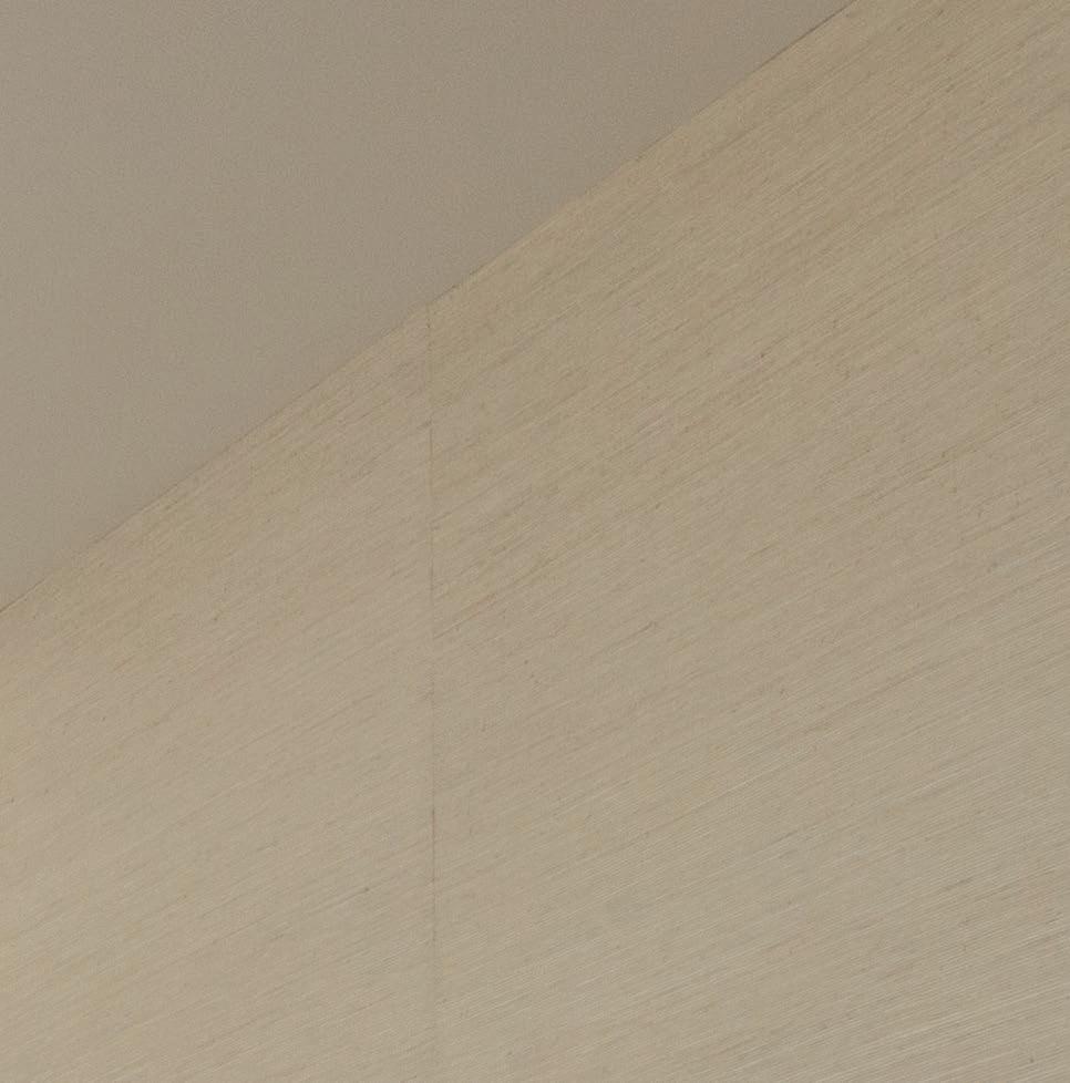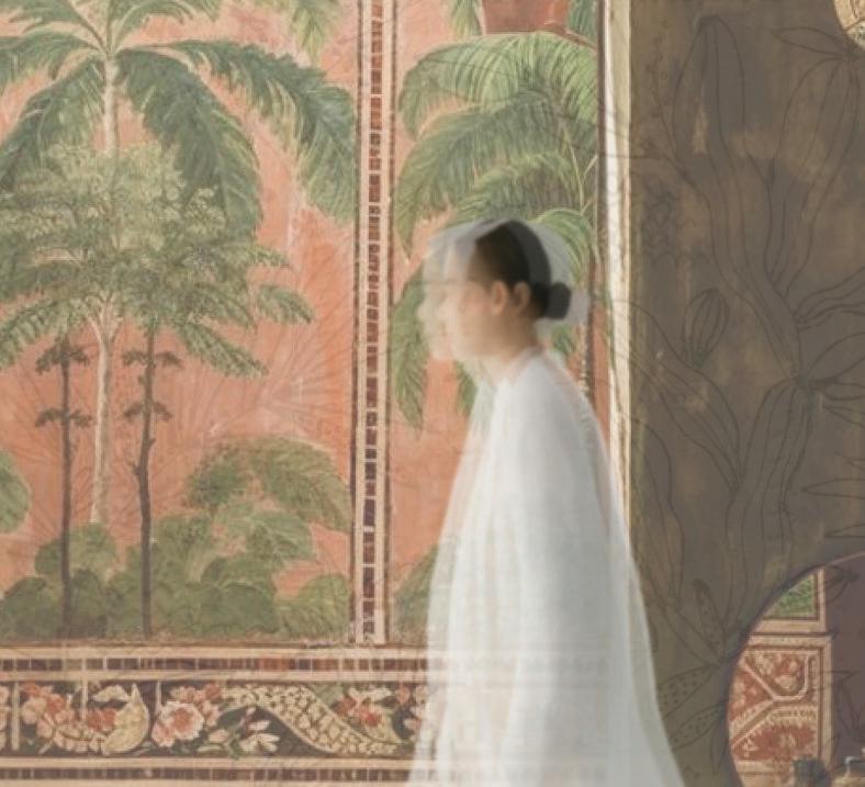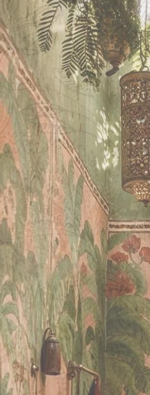 De proporciones generosas y tonos verdes y blancos, flotan a distintas alturas, mientras un papel decorativo de hojas enfatiza la altura de las paredes.
