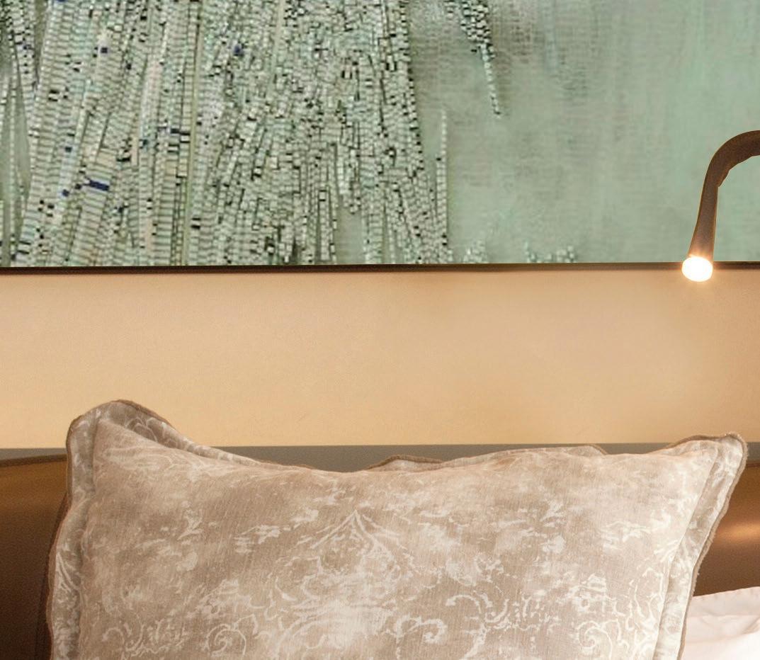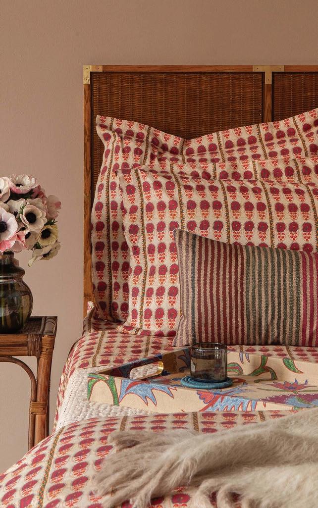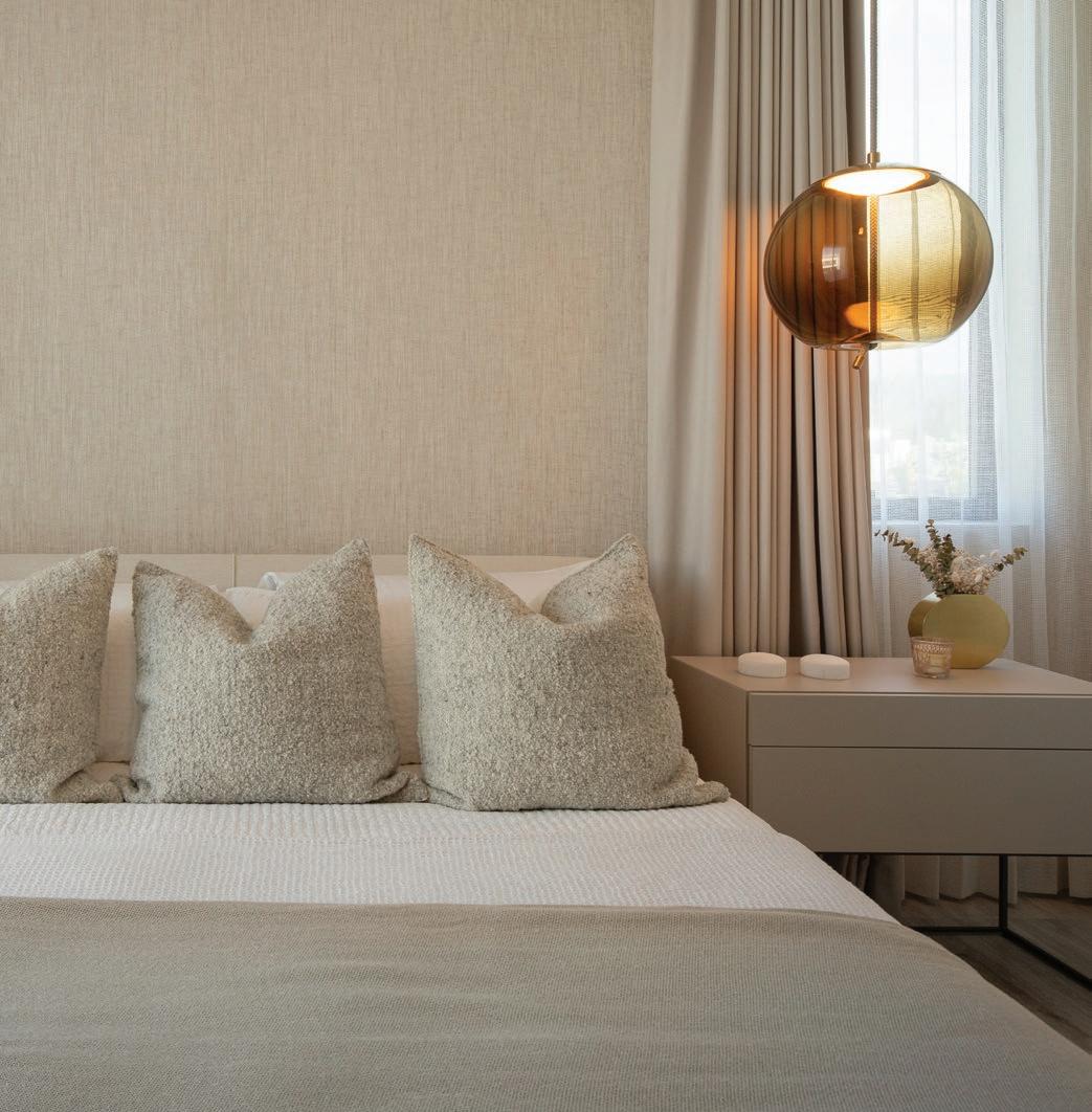 En la habitación principal, las lámparas colgantes sobre las mesas de noche liberan la superficie y aportan modernidad, mientras capas de textiles, alfombras y papeles decorativos construyen una atmósfera acogedora.