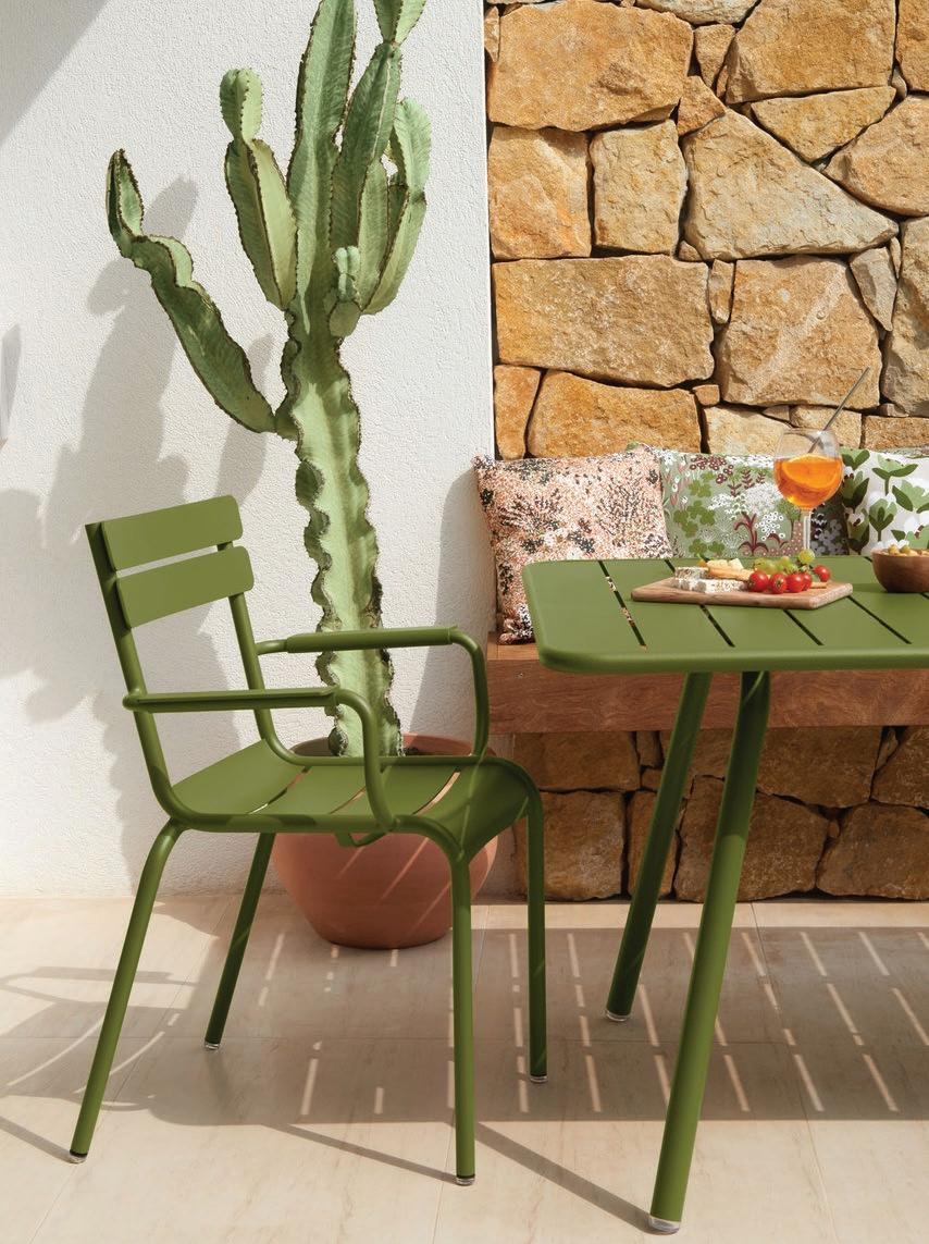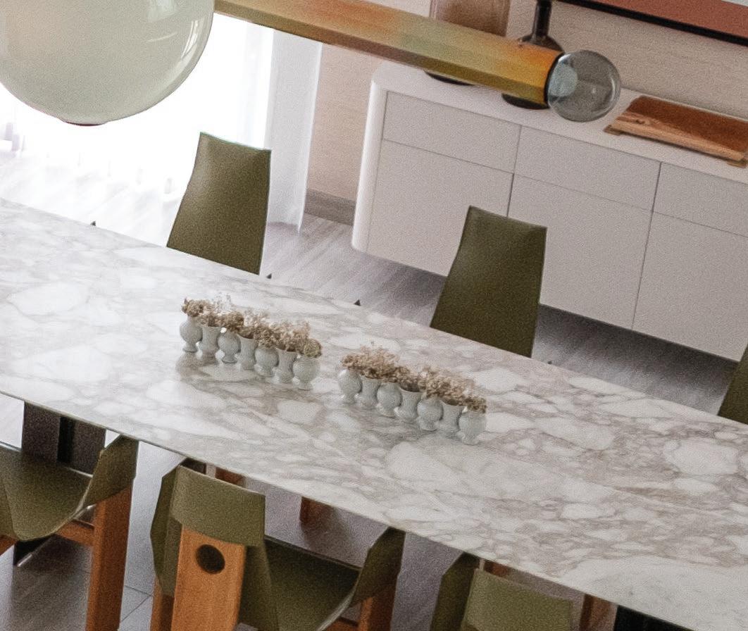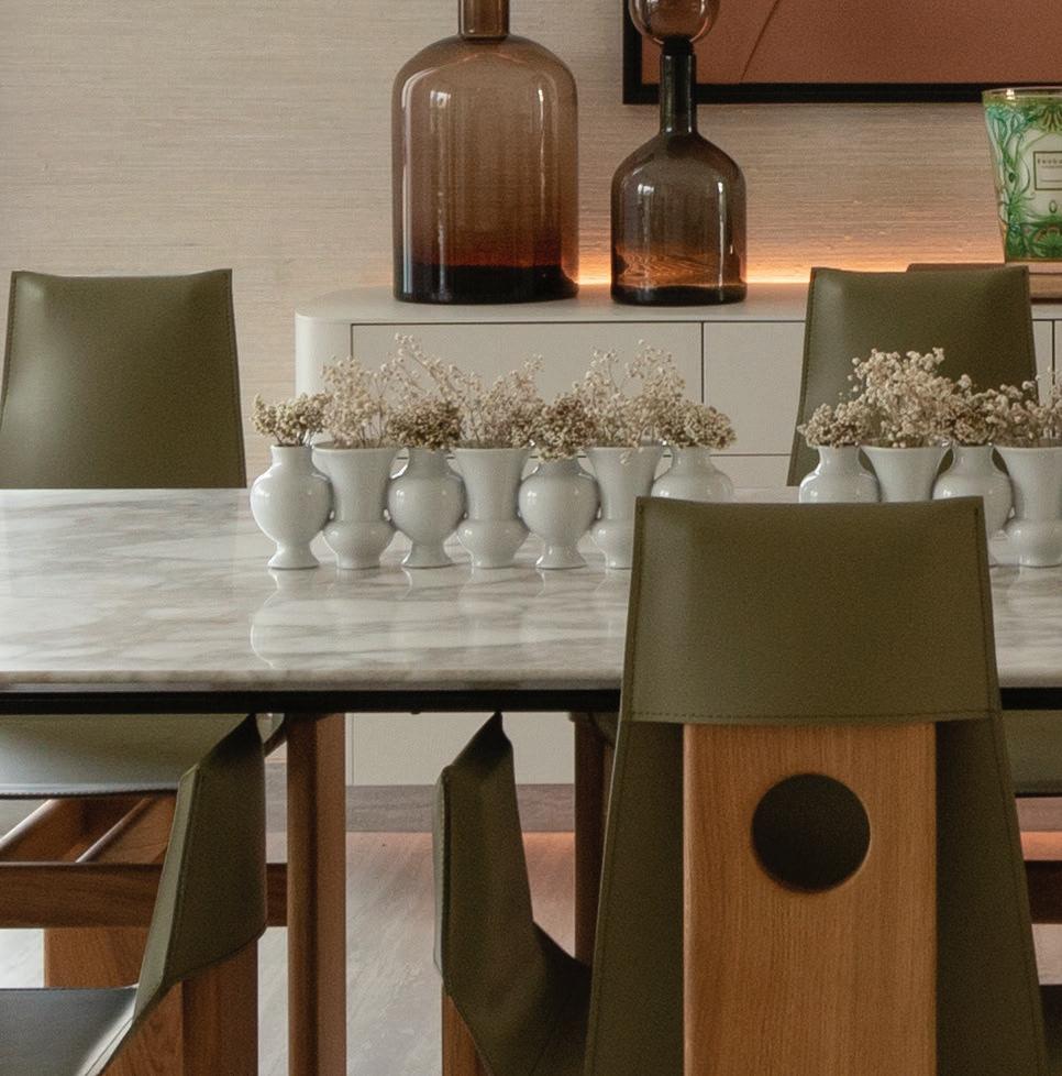 El comedor es un homenaje a lo orgánico: sillas en tonos verdes que evocan follaje, una mesa con tope de mármol que aporta sofisticación, acentos en brass en la lámpara lineal y un golpe de terracota en la obra de arte que corona la pared.