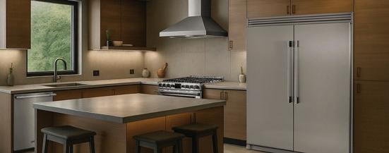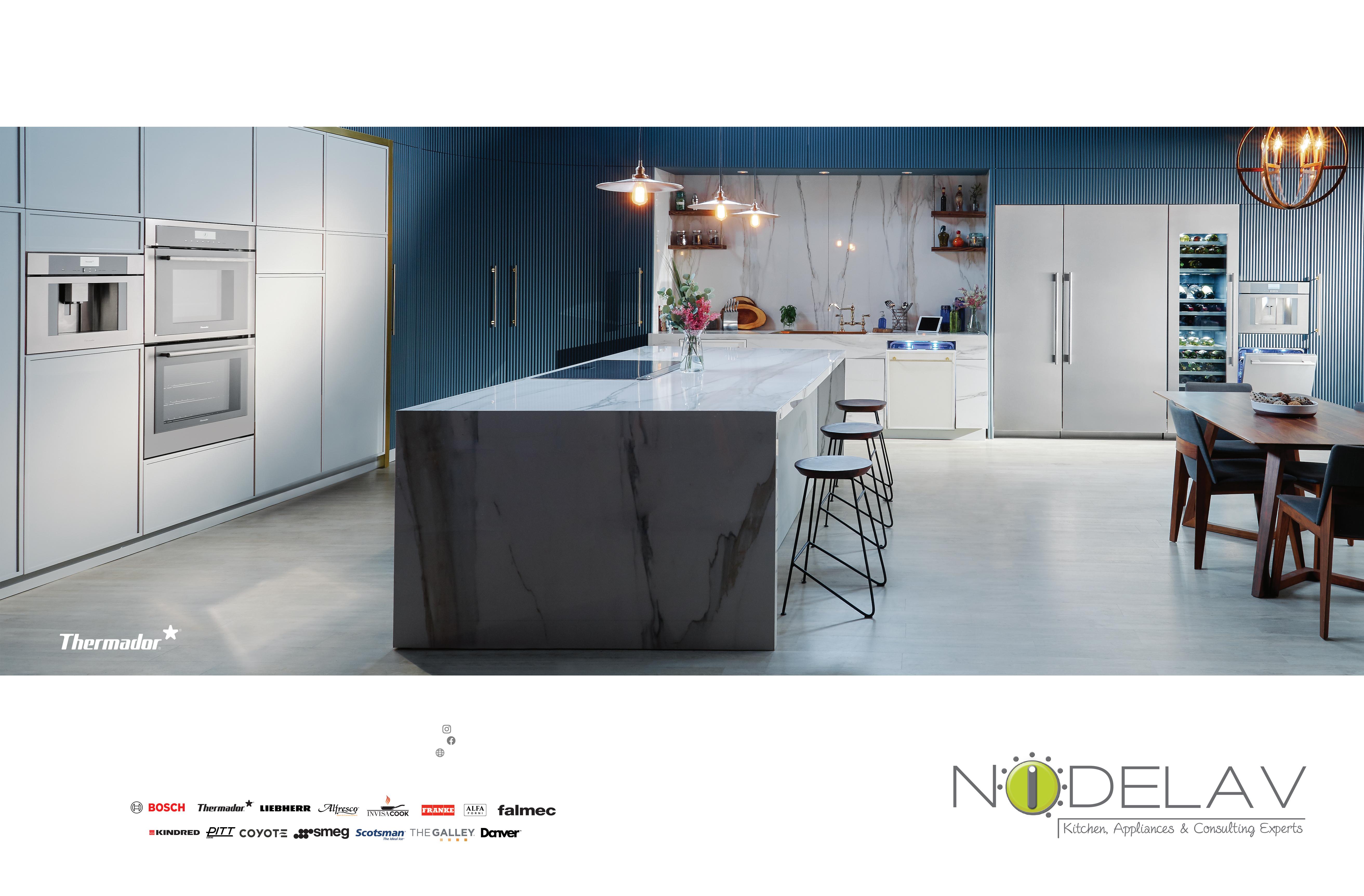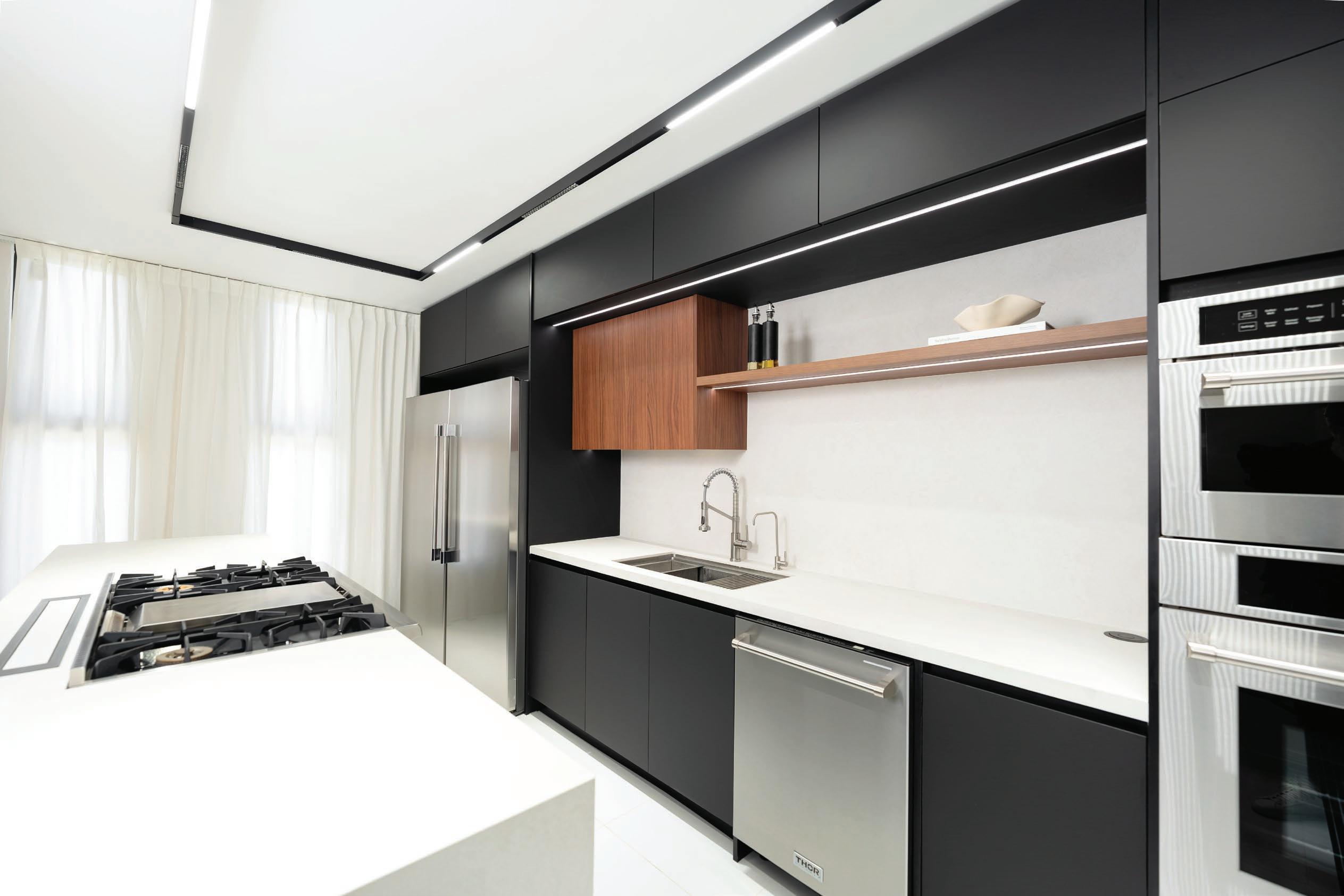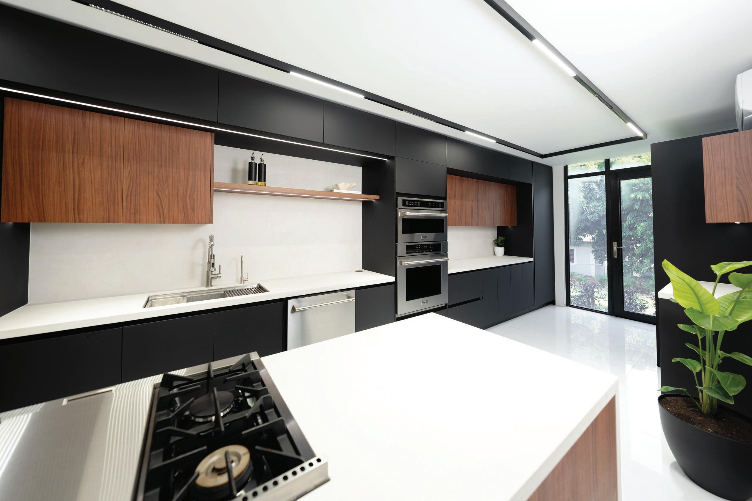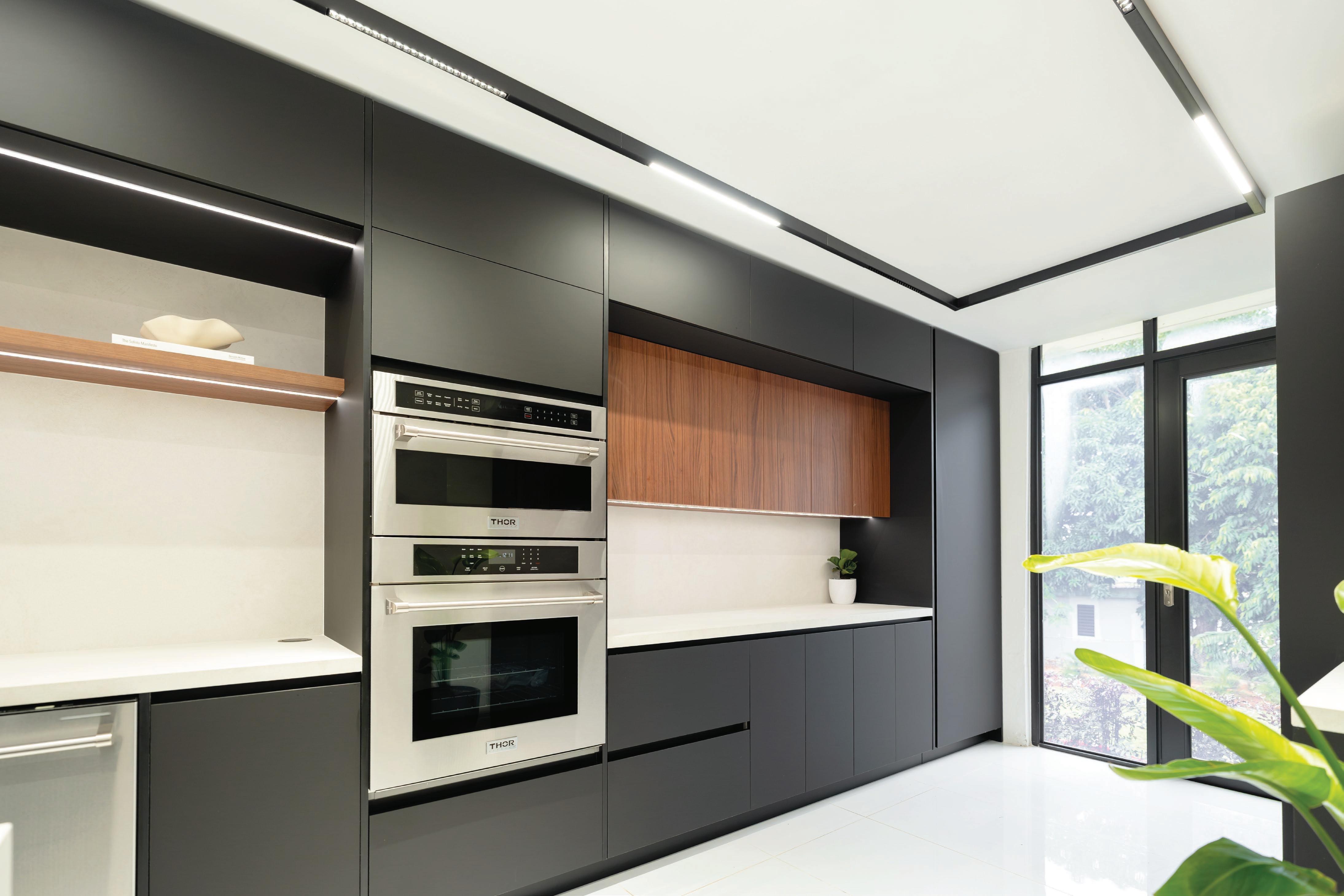 para crear la cocina de sus sueños, diseñada también como su estudio de producción. Nuestro equipo desarrolló el mobiliario en Superpan, acompañado de un elegante tope de Inalco y electrodomésticos de THOR. Todo disponible en un mismo lugar: Caribbean Cabinet.