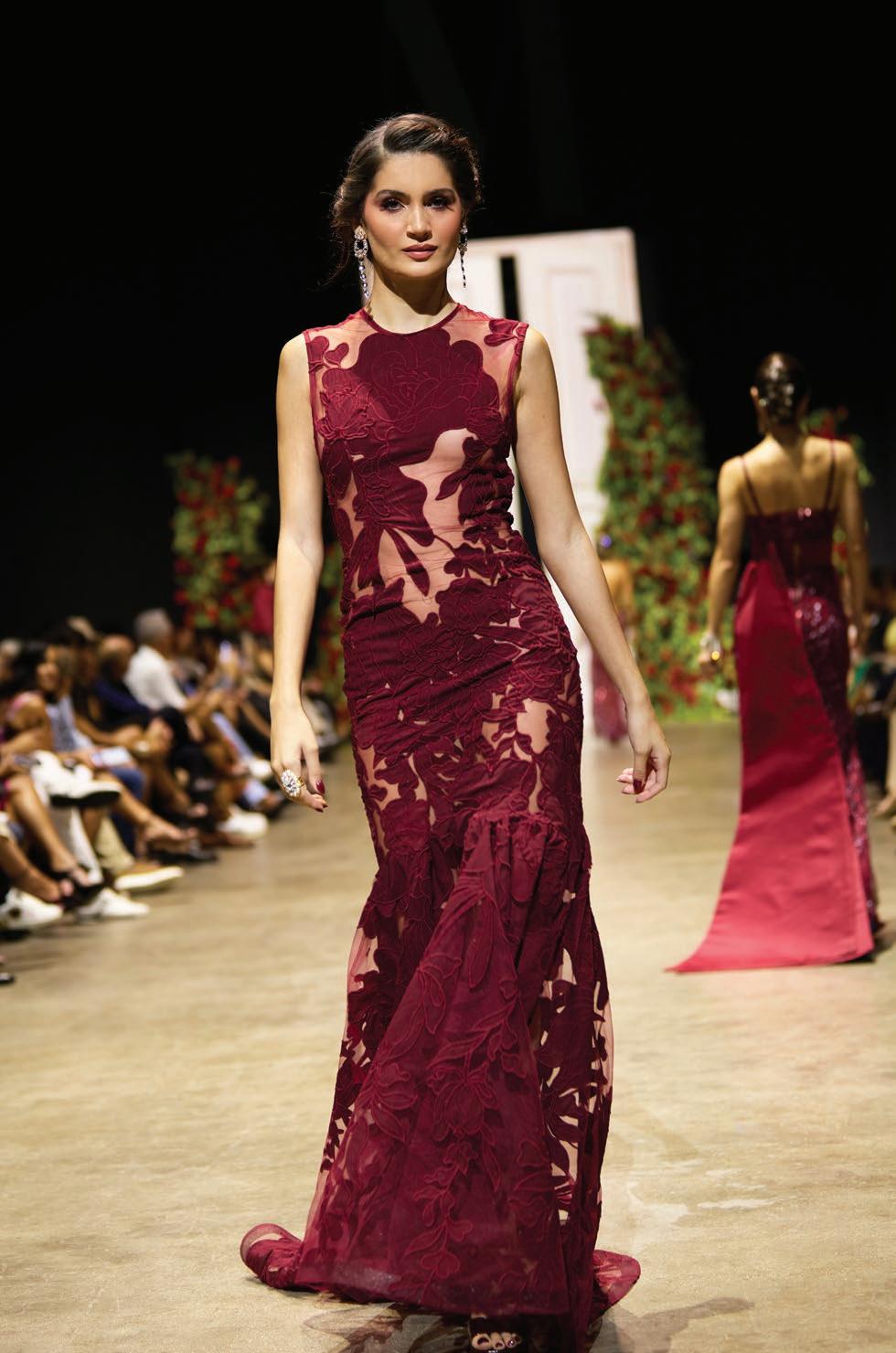 Cada vestido de cóctel, trabajado con encajes etéreos y movimiento, dialogaba con trajes de cortes impecables para caballero, reflejando poder y presencia.