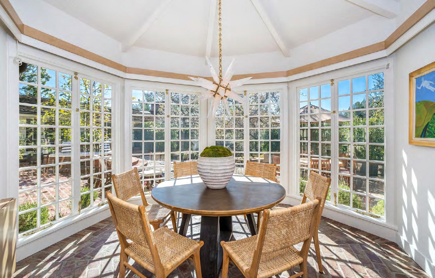La sala de estar, el comedor y las habitaciones familiares fluyen juntas con pisos de madera y piedra pulida, chimeneas y amplias ventanas con vistas a los exuberantes jardines. La cocina del chef, muy bien equipada, ofrece una barbacoa interior. Un desayunador circular da a los perales en flor.