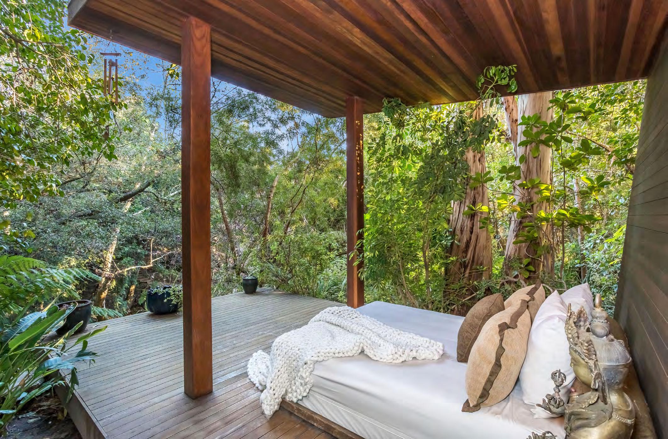 Los senderos para caminar serpentean a través del ambiente sereno, lo que lleva a la plataforma de yoga y meditación. Carrey llamó a la casa "un lugar de encanto e inspiración" y espera que siga siendo "un santuario mágico" para su próximo ocupante.