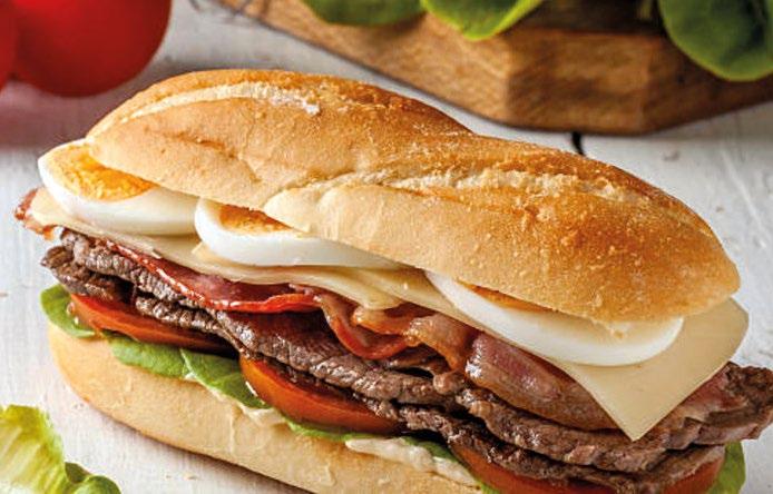 Lleva lomo de res, jamón, queso, huevo y vegetales en pan pebete o francés: abundante y presente en todo el país.