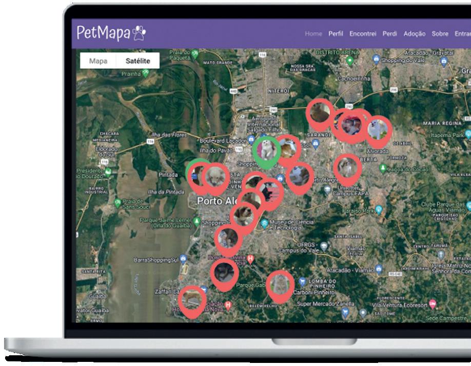 l A plataforma PetMapa atua na conexão entre os cachorros e gatos perdidos nas enchentes do Rio Grande do Sul e seus tutores. o site mostra, por meio de ferra mentas de geolocalização, o registro dos animais de estimação perdidos e o local onde foram vistos pela última vez. Cerca de 3.000 pets já foram mapeados e mais de 500 conseguiram ser reconectados com suas famílias por meio da iniciativa. n mapa da plataforma, os pins em vermelho são para animais que os tutores estão procurando e os verdes para pets já resgatados. RB https://petmapa.com.br/