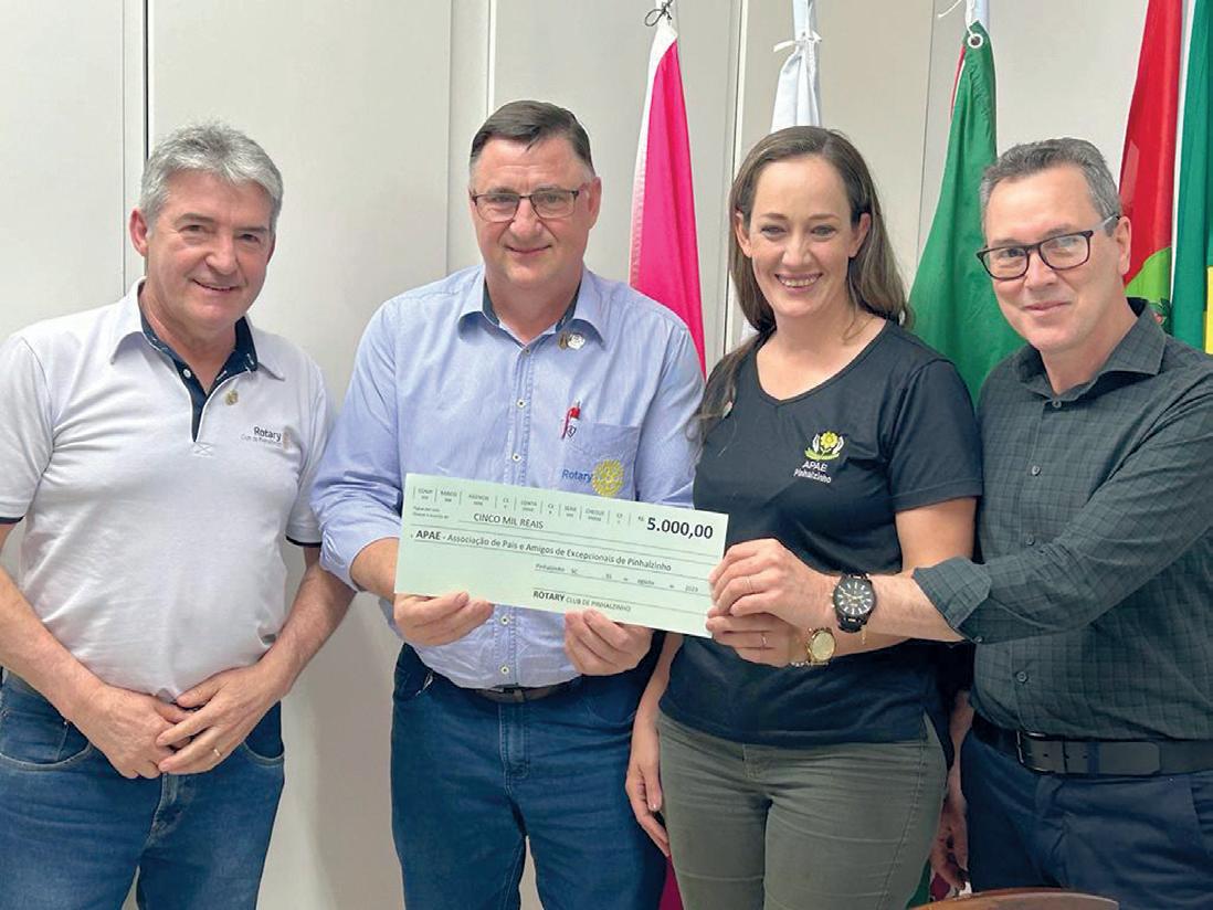l Com os recursos obtidos na 20ª Feijoada, evento que reuniu mais de mil pessoas e teve diversos apoiadores, o Rotary Club de Pinhalzinho, SC, partilhou R$ 16 mil entre Apae, Associação Beneficente Hospitalar de Pinhalzinho, Casa da Amizade, Rotaract e Interact locais. A entrega para as instituições beneficiadas ocorreu na sede do clube em 31 de agosto e foi prestigiada pelo governador do distrito, Marcus Vinicius Ferreira d’Agostini.