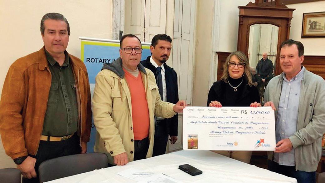 l Em reunião realizada em 18 de julho, o Rotary Club de Uruguaiana-Sudeste, RS, entregou um cheque simbólico de R$ 45 mil ao Hospital da Santa Casa de Caridade de Uruguaiana. O valor foi arrecadado na 42ª Festa do Arroz promovida pelo clube e será utilizado na aquisição de materiais para o setor de cardiologia da unidade hospitalar. Distrito 4780