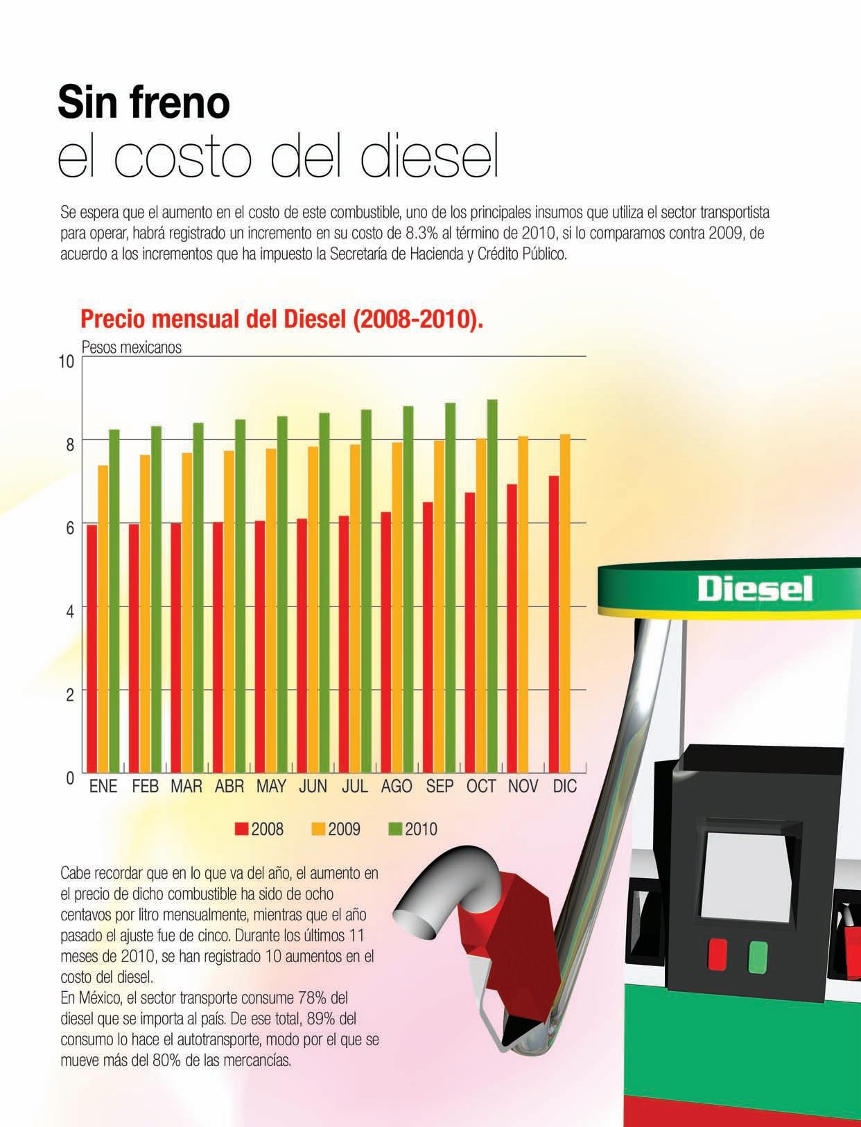 LorenzoReyesRetana explicaqueeldieseleselcosto deoperaciónquemáshacrecido enelúltimoaño,alpasarde 6.62pesosporlitroquesetenía enoctubredelañopasadoa 7.25pesosporlitroenoctubre de2010.