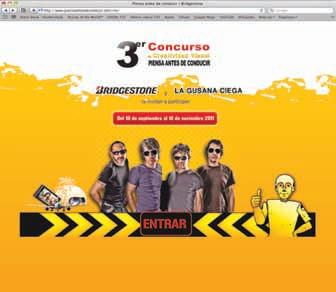 http://www.piensaantesdeconducir.com.mx/ Cadaaño,desdehacetres,Bridgestonede MéxicolanzaelConcursoCreatividad VisualPiensaAntesdeConducir,unacampañadeseguridadvialqueconvocaa jóvenesuniversitariosaqueparticipencon carteles,fotografíaospotsenvídeoque promuevanlaculturavialenMéxico.Ensu páginawebseencuentralasbasespara participar,lascategorías,premiosyun apartadoconconsejosdeBridgestoneala horadeconducir.