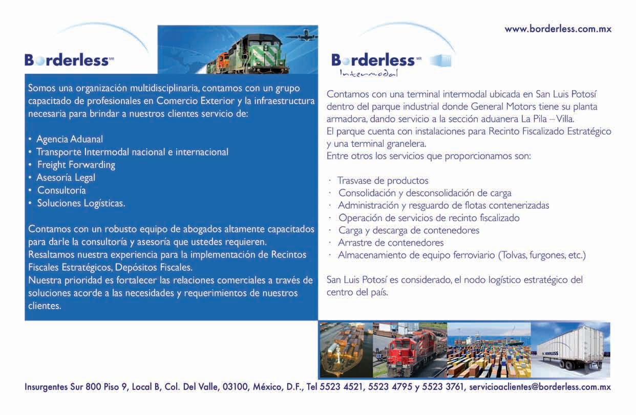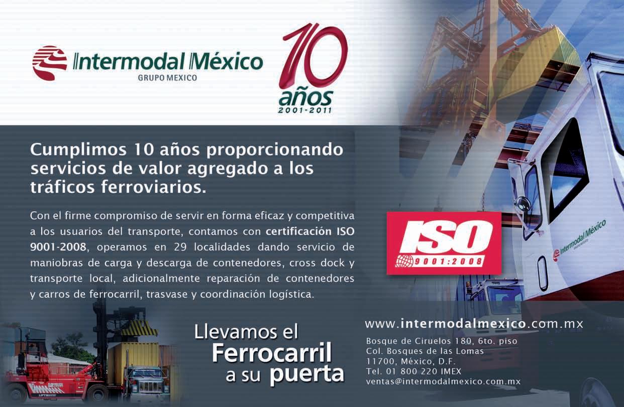 Aunadoaello,losferrocarriles deberáncontinuarrealizandofuertesinversioneseninfraestructura,fundamentalmente,enlamodernizacióndetrazosycalibresderieles,prolongacióndeladeros, libramientosenciudadesyterminalesde todaíndole;conlosferrocarrilesyelgobiernodeEstadosUnidos,tambiénse deberánrealizarinversionesparafacilitar loscrucesfronterizos,especialmente,en NuevoLaredo,CiudadJuárezyElPaso; ademásdelocomotoras,puesloscarros, generalmente,sonarrendados,mejoras queaméndelesfuerzoenreduccionesde costos,propiciaríanunamayoreficiencia delservicioyunamejoraencompetitividad.