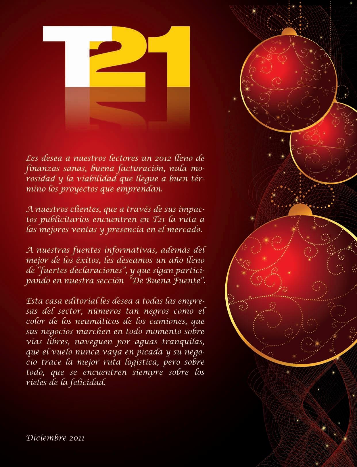 Conestaedicióndamosfina2011ylo invitamosamantenersupreferenciapor laRevistaT21.Ledeseamosmuyfelices fiestasdecembrinasymuchoéxitoen losproyectosquetengaparalos siguientesaños.