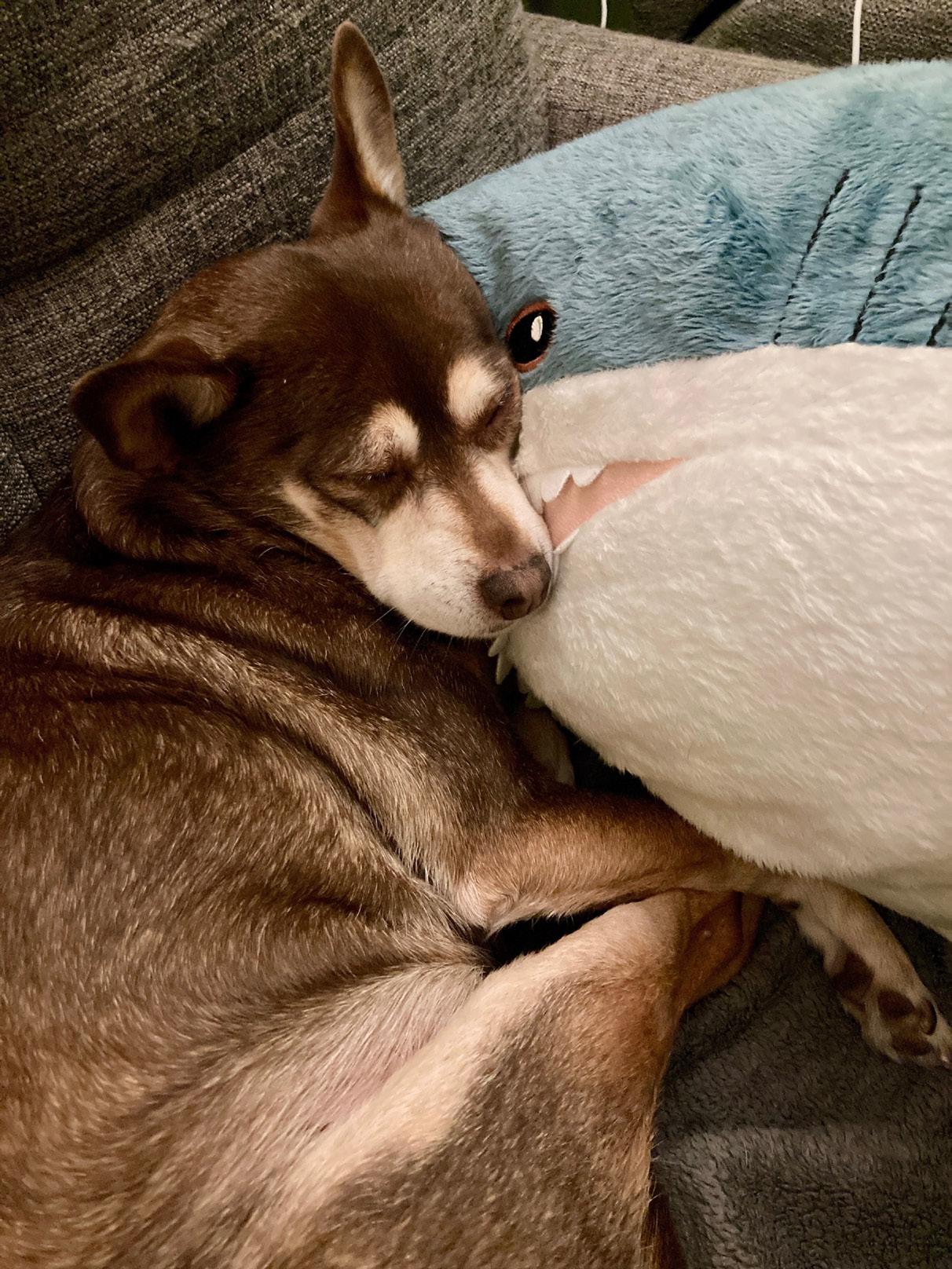 This is our beloved senior chihuahua mix, Reese. Lately she has loved nothing more than curling up with this stuffed shark. As I am recovering from surgery, the site of her with her new companion comforts my soul.