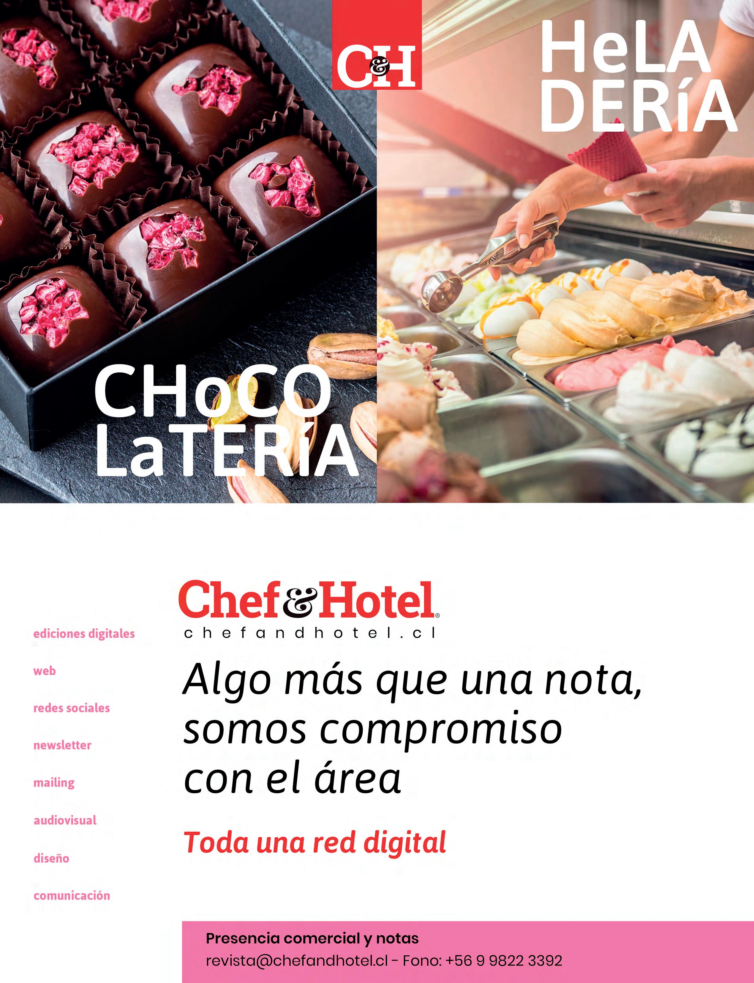 Revista Chef&Hotel publicación profesional independiente de hotelería, gastronomía y turísmo en versión digital con una entrega mensual a más de 9.500 personas relacionadas con el área. Difundida por web, redes sociales y newsletter directo a gerentes, chefs, dueños y administradores, etc., responsables de las decisiones de compra en hoteles y otros tipos de alojamientos, restaurantes, delivery, casinos, pastelerías, cafeterías, clínicas, operadores turísticos, agencias de turismo, empresas proveedoras, etc.