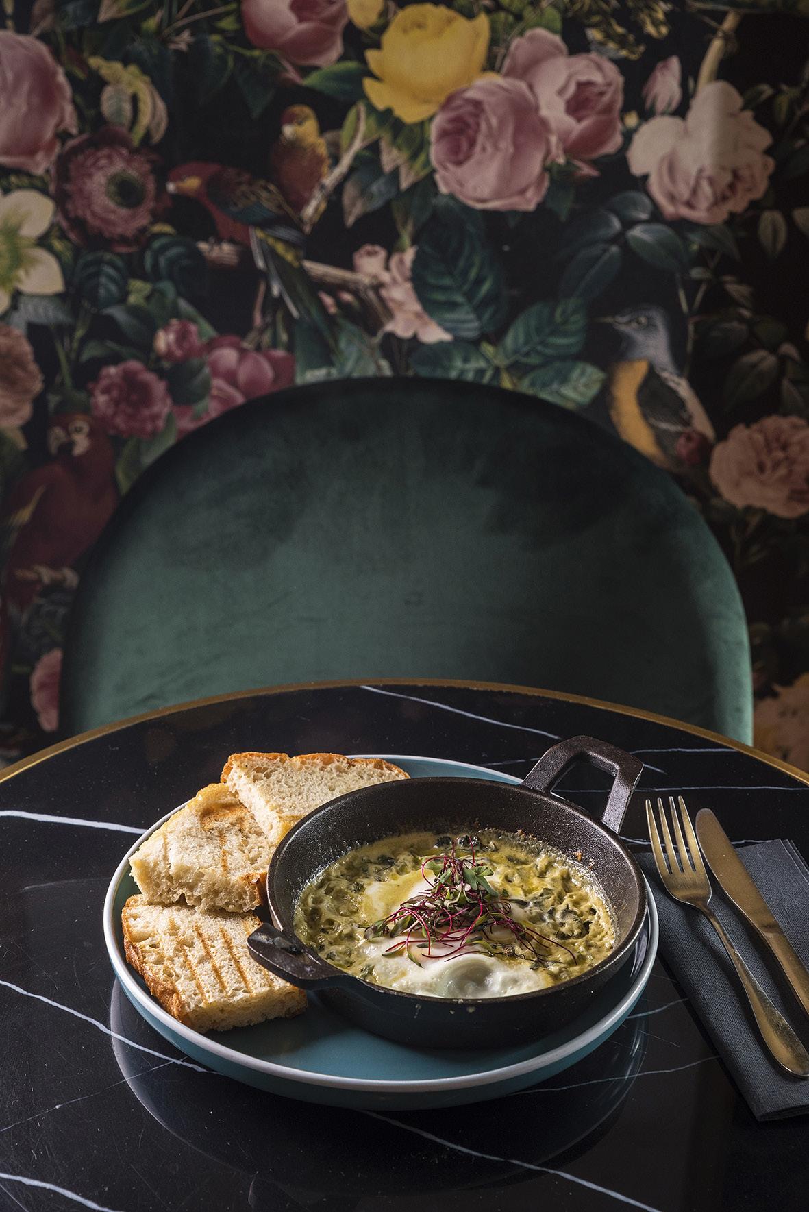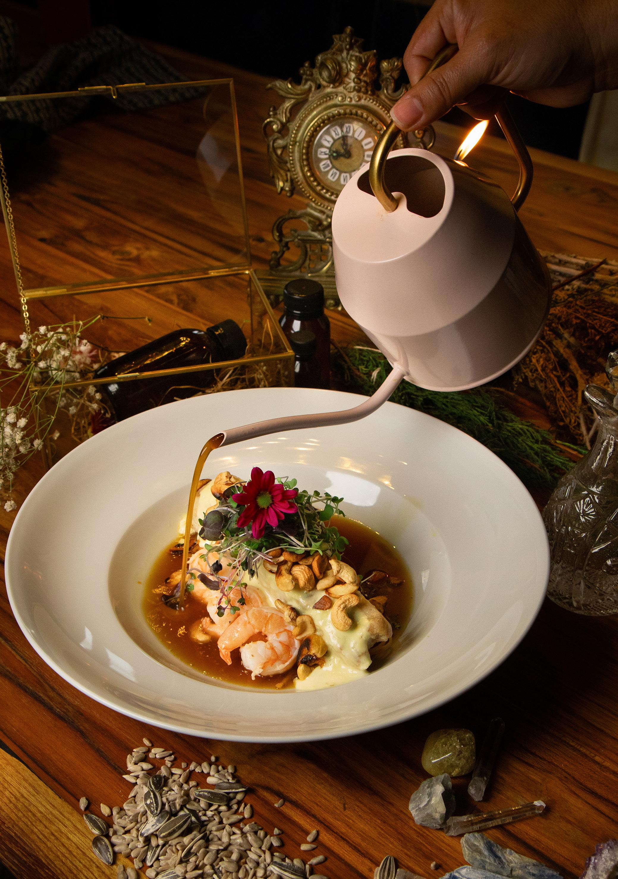 Y es que, cada uno de los espacios ofrece una experiencia única de acuerdo con la zona que se elija. En el salón principal, las protagonistas son las mesas de madera en las cuales se aprecian bajo un vidrio, objetos antiguos como utensilios de cocina, cristales y libros con recetas. Sobre estas, cuelgan lámparas de una luz baja y ramas de eucalipto que consumen el lugar con un aroma único.