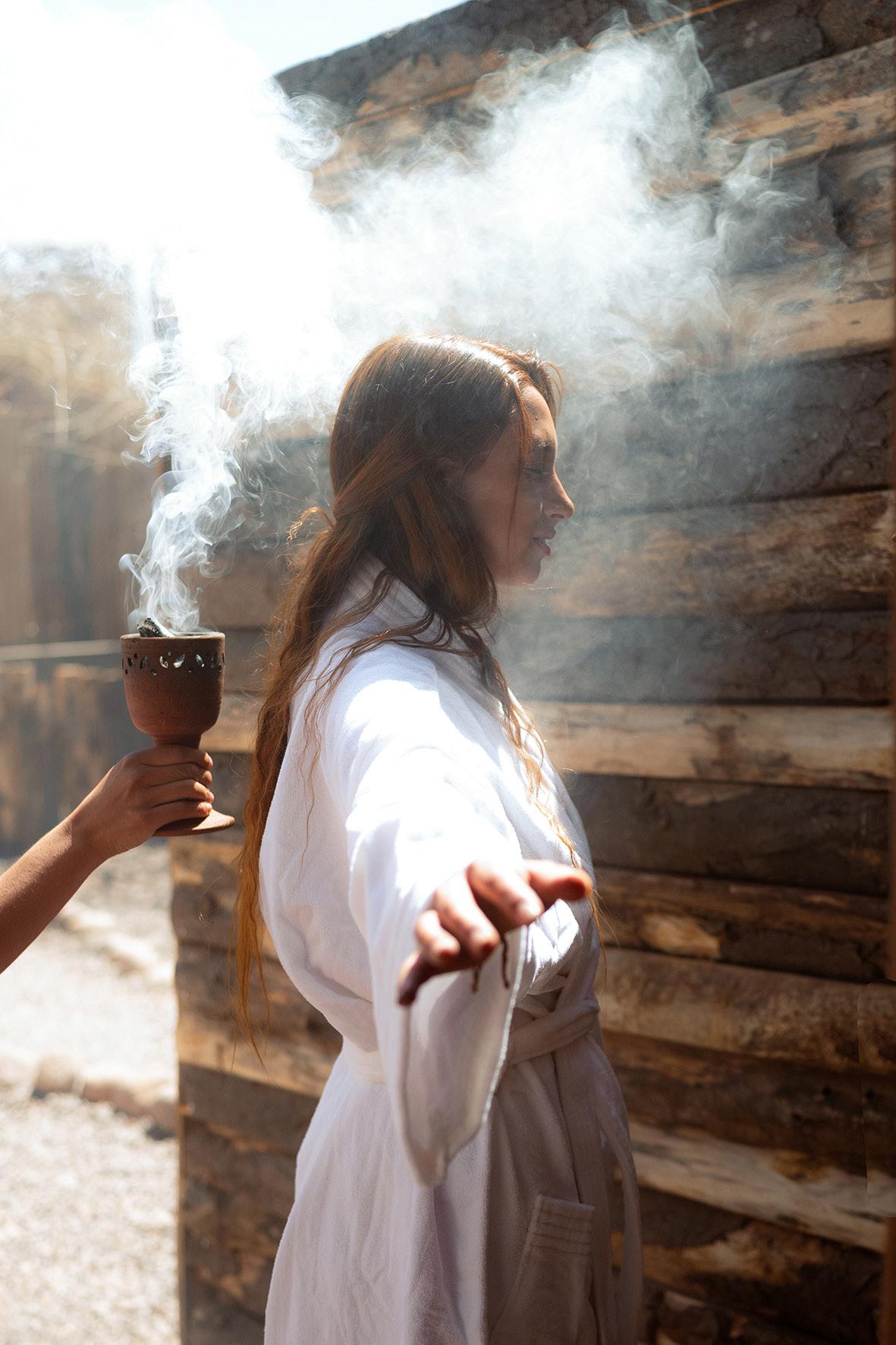 LA ATENCIÓN: PAREDES OSCURAS CON PEQUEÑAS AVES NATIVAS PINTADAS A MANO, UNA ILUMINACIÓN TENUE, ALGUNOS ESPEJOS, MUEBLES ANTIGUOS QUE NOS HACEN RECORDAR LAS CASAS DE NUESTRAS ABUELAS, VELAS Y PLANTAS AROMÁTICAS EN CADA UNO DE LOS RINCONES