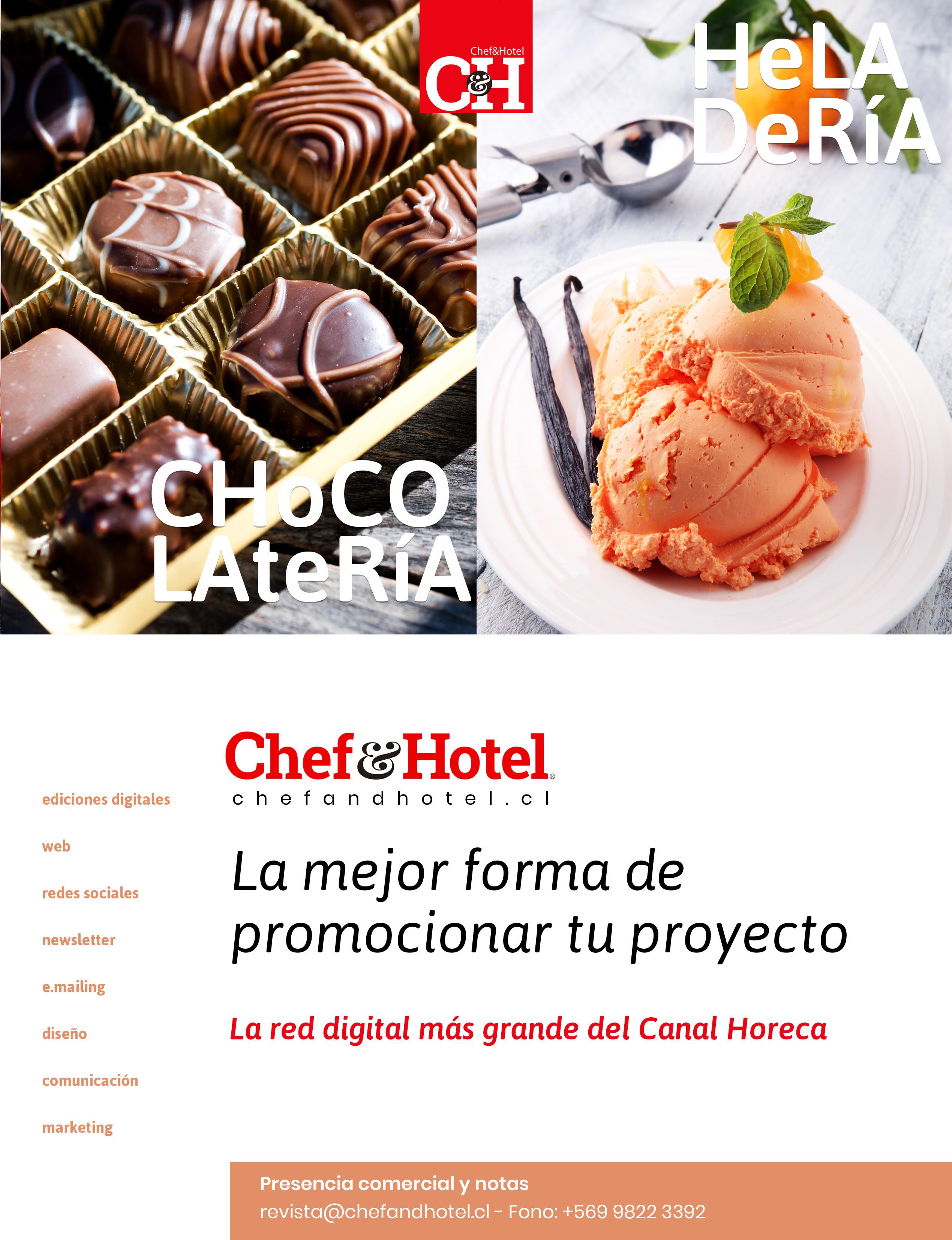 Revista Chef&Hotel publicación profesional independiente de hotelería, gastronomía y turísmo en versión digital con una entrega mensual a más de 14.100 contactos relacionados con el área. Difundida por web, redes sociales y newsletter directo a gerentes, chefs, dueños y administradores, etc., responsables de las decisiones de compra en hoteles y otros tipos de alojamientos, restaurantes, delivery, casinos, pastelerías, cafeterías, clínicas, operadores turísticos, agencias de turismo, empresas proveedoras, estudiantes, etc. Revista Chef&Hotel es marca registrada de Hurtado y Cía. Ltda. la que no se hace responsable de los artículos firmados por clientes o columnistas, así como la información o publicidad que ellos entregan. Se prohibie la reproducción total o parcial de su contenido periodístico y fotográfico, sin la previa autorización de la empresa editora.