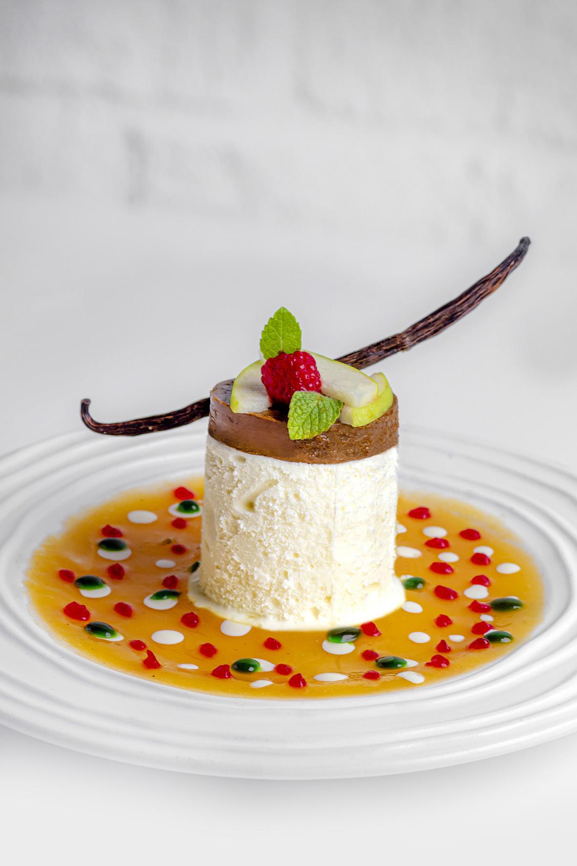 CHEESECAKE INVERTIDO | Gelificado de piña, frambuesa y kiwi con gotas de chocolate blanco. Helado de queso de cabra. Corona de Praline de pistacho, manzanas, frambuesa. Perfumado con vainillaLa historia se cubrió de apetito por especias, su comercio construyó imperios económicos, inició guerras y sometimiento de pueblos, motivó grandes campañas de apasionados aventureros y todo, por su posesión.