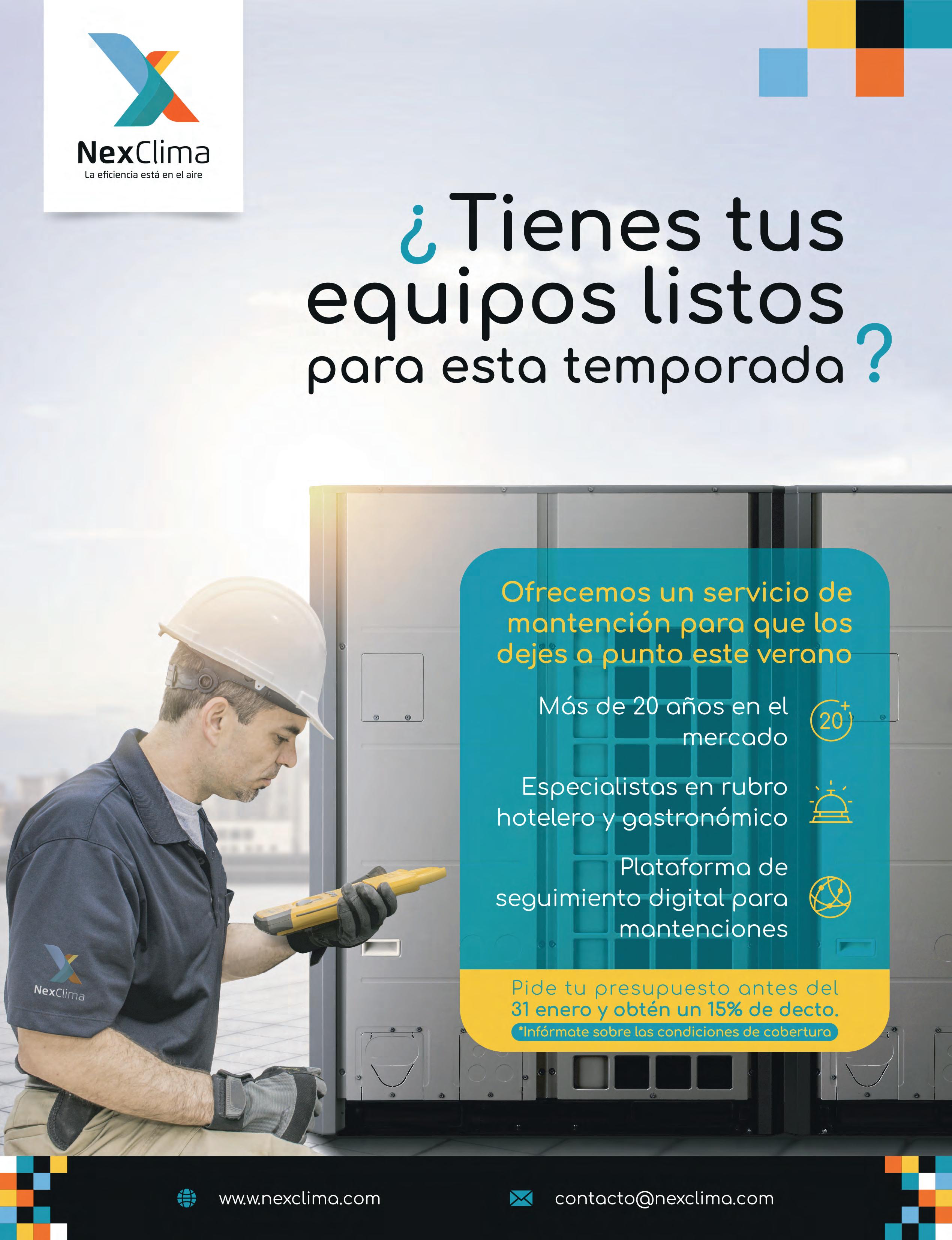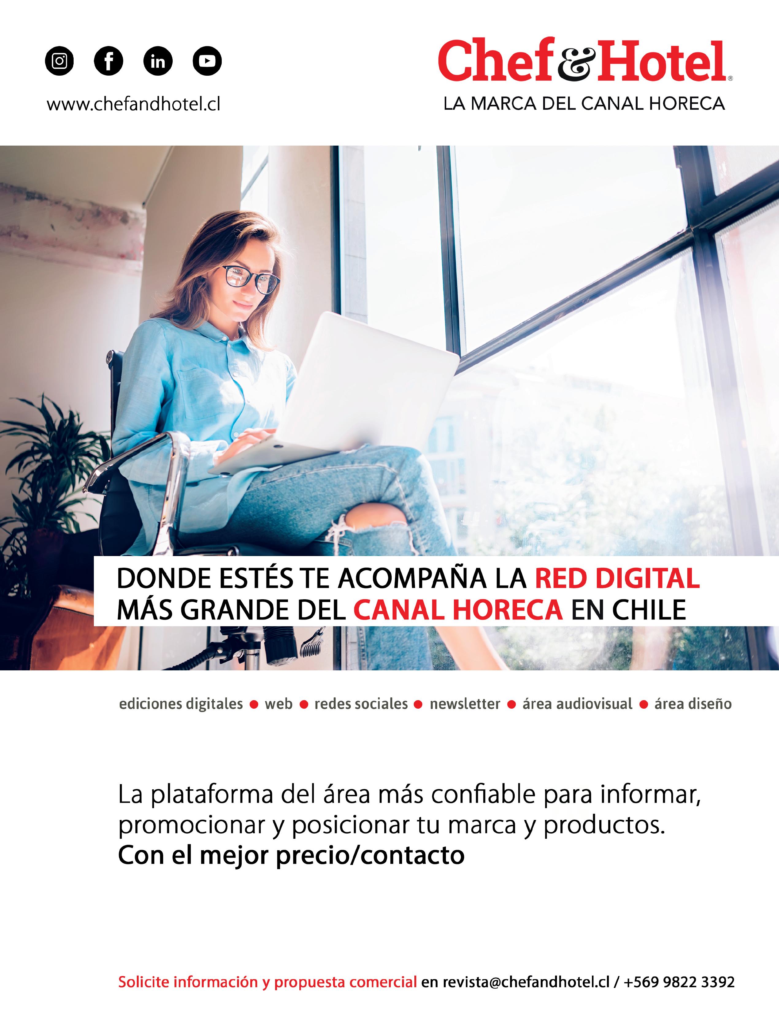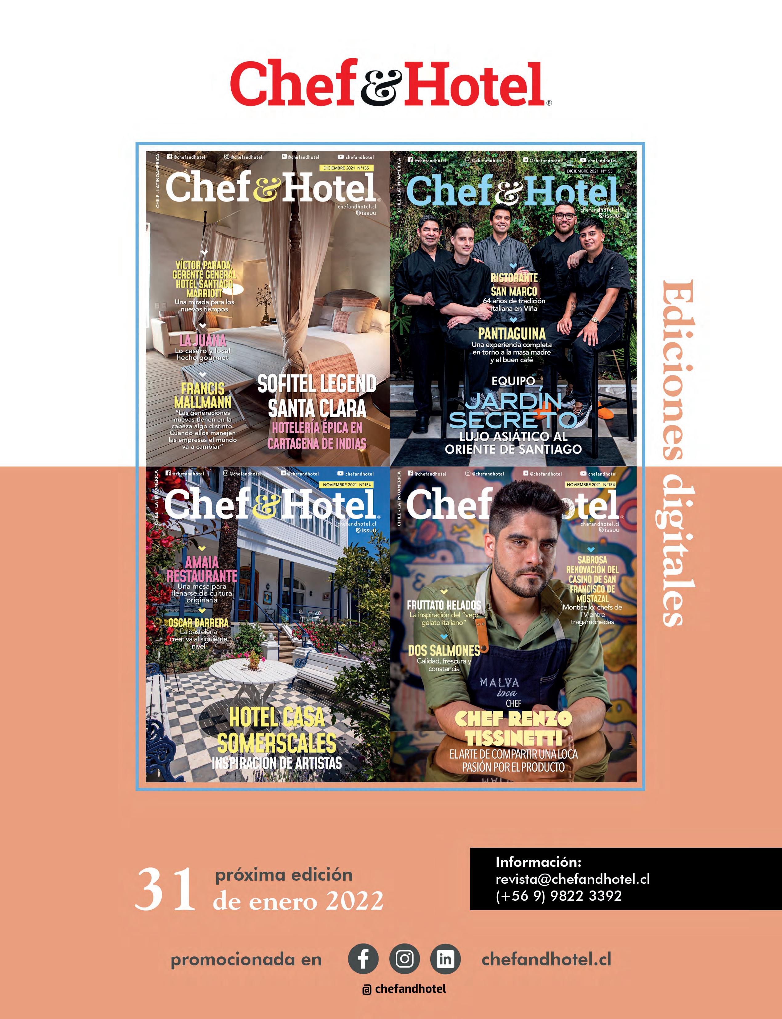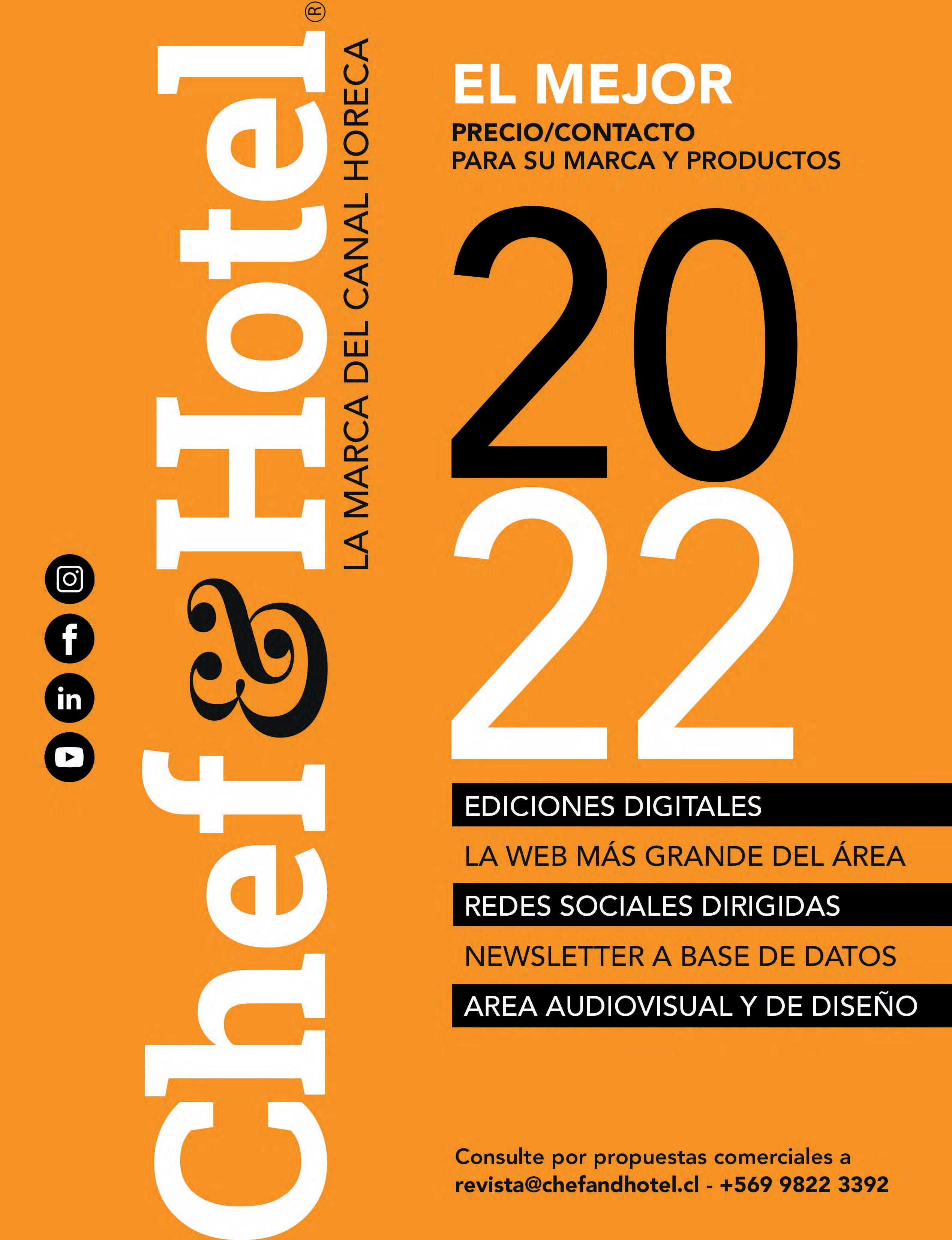 Como ha sido nuestro compromiso desde el comienzo de Chef&Hotel, nos esforzaremos por destacar en cada número las novedades de la actividad del canal HORECA y de los profesiona les vinculados a la gastronomía, hotelería y turismo de Chile y Latinoa mérica. Dentro de este cometido estaremos muy atentos, más que nunca en el desarrollo del Food Service y de las nuevas tendencias de la gastronomía que se han manifestado y acelerado en los últimos años, como también las que se proyecten en el futuro.