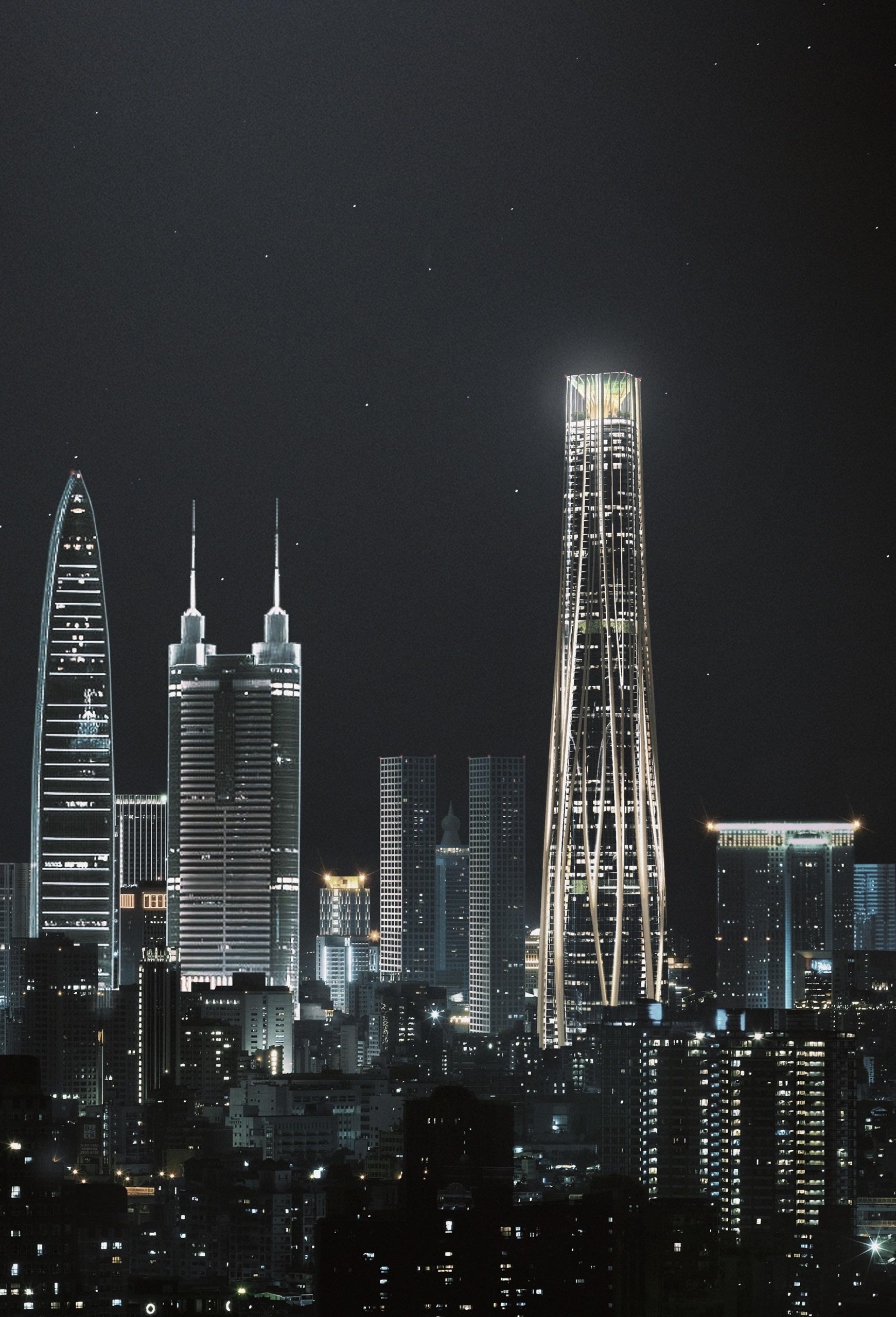 As the city of Shenzhen developed and grew, a multitude of faceless glass towers multiplied and replicated across the city. Based on principles of economy and uniformity, the city grew in density but lacked in architectural character and placemaking. Hubei Tower has the opportunity to elevate the architectural scene of the Luohu District, and to create an iconic landmark for the city and a unique public space for its residents. Instead of another unforgettable boxy glass tower, we propose that Hubei Tower should be an organic shaped tower with sinuous lines inspired by nature. Through the monotony of the surrounding residential and commercial towers, the Hubei Tower - the Shenzhen Tree - will emerge as a beacon of hope for the future.
