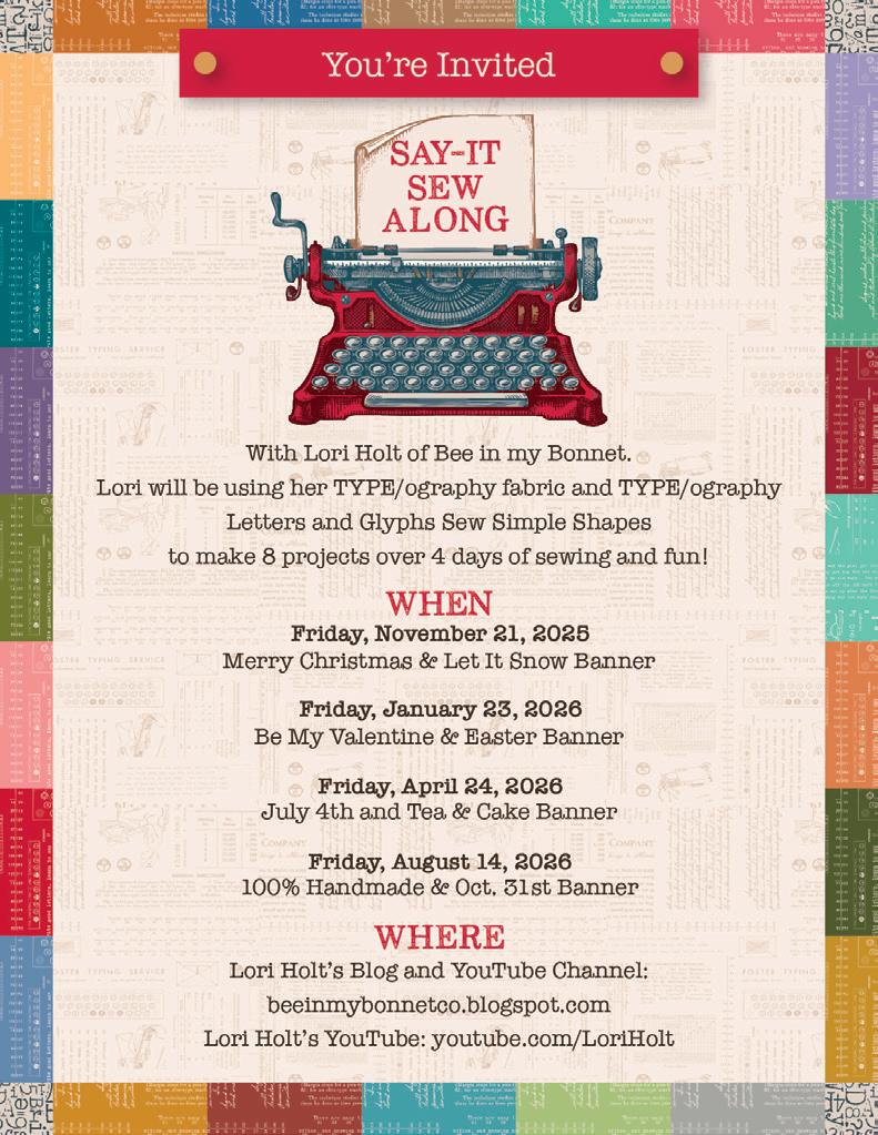 Type/ography by Lori Holt of Bee in my Bonnet is a vintage-inspired collection that celebrates the art of type . Featuring a mix of classic fonts, typewriter prints, and retro design elements, this collection evokes nostalgia with its timeless charm Perfect for creating projects that blend old-school style with a modern quilting twist in Lori’s signature colors of Schoolhouse, Latte, Autumn, Alpine, Denim and so many more!