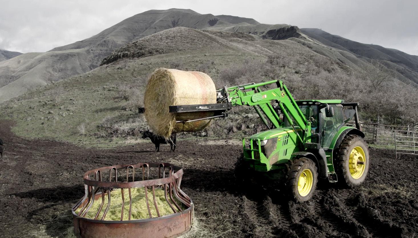 The arms can be rotated up, out of the way, pulling the wrap off the bale. The bale is then dumped into the feeder. The tractor operator can release the hooks and dump the wrap in a pile outside the pen. The WTR can handle 4’x5’,