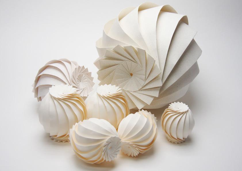 many genres from simple figurative work to modular origami, tessellations and corrugations. Fuse foregrounds the act of folding with hands without the use of tools and ‘thinking through folding’ to discover new patterns. Although she is the only artist featured in the exhibition without a formal research-based practice, Fuse’s highly explorative and methodical approach constitutes a form of research through practice, wonderfully illustrated in her work on spirals, shown in the exhibition. Her book Spiral (2012) explains how each piece leads on to the next or is an amalgamation of concepts, much like Timothy Ingold’s notion of meshwork in which each point in the mesh influences and is influenced by the other1. Each of her works begins by identifying the parameters that affect the folding. She then explores what happens when certain parameters are fixed or changed – a model of experimentation that informs her larger or more complex pieces. For her work with tessellations for example,