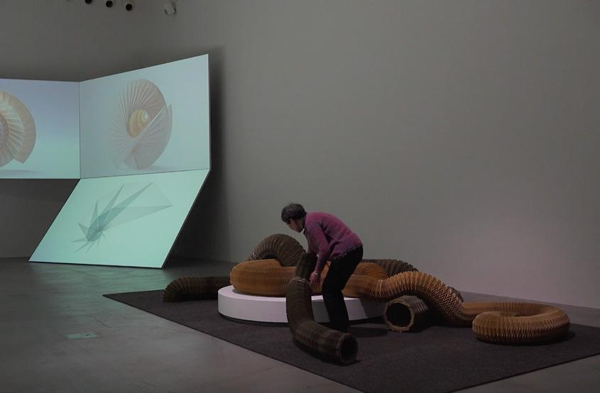 Fuse ingeniously combines simple twistbased tessellation techniques to form the almost tapestry-like pieces presented in this exhibition. The centre piece of Future Folds is Fuse’s artwork Orochi, which uses a variation of the Miura-Ori corrugation. The innovation of this work is in how she alternates the angles in each row, which leads the normally flat Miura to curl into a tube. The tubes of various dimensions are then stretched to create an organism-like composition inspired by the Japanese mythical creature ‘Yamata no Orochi’. The Orochi tubes are highly flexible, and a significant aspect of this work is how Fuse ‘performs’ the installation process. During the panel discussion, Fuse remarked that the making and installation of these pieces is for her a mediative process, which can lead her into a flow state.