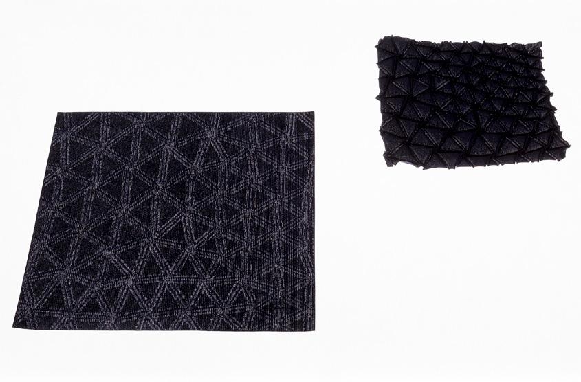 the engineering design company Nature Architects, which generates a diagram for the complex pleated geometry and calculates the fabric’s shrinkage pattern to enable transformation into the desired shape. This collaboration brings together computational design, material innovation and origami to make innovative fabrics and clothing that could not have been created using traditional techniques.