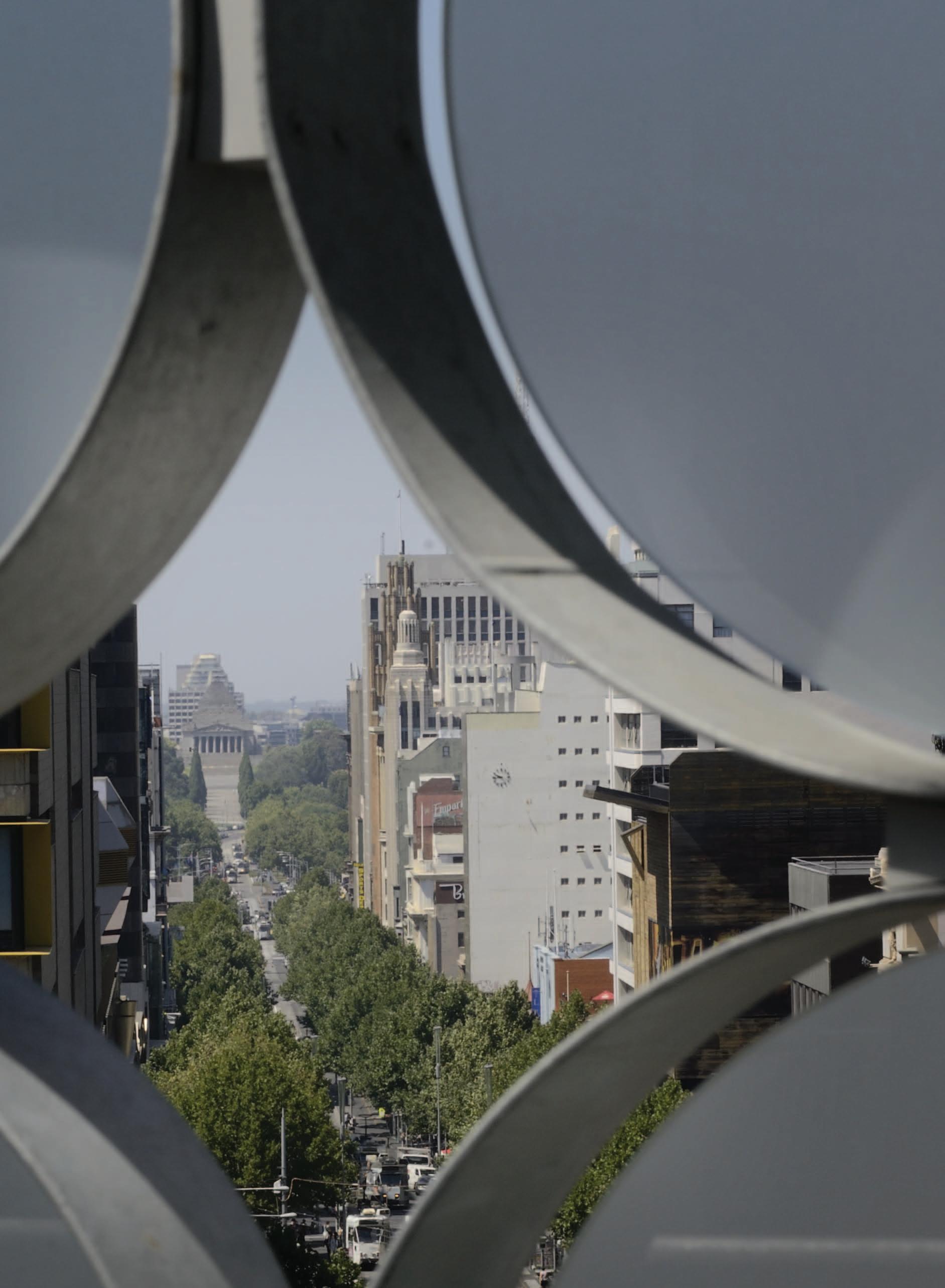 RMIT Design Hub View from rooftop down Swanston Street to the Shrine of Remembrance Sean Godsell Architects in association with Peddle Thorp Photographer: Georgina Matherson