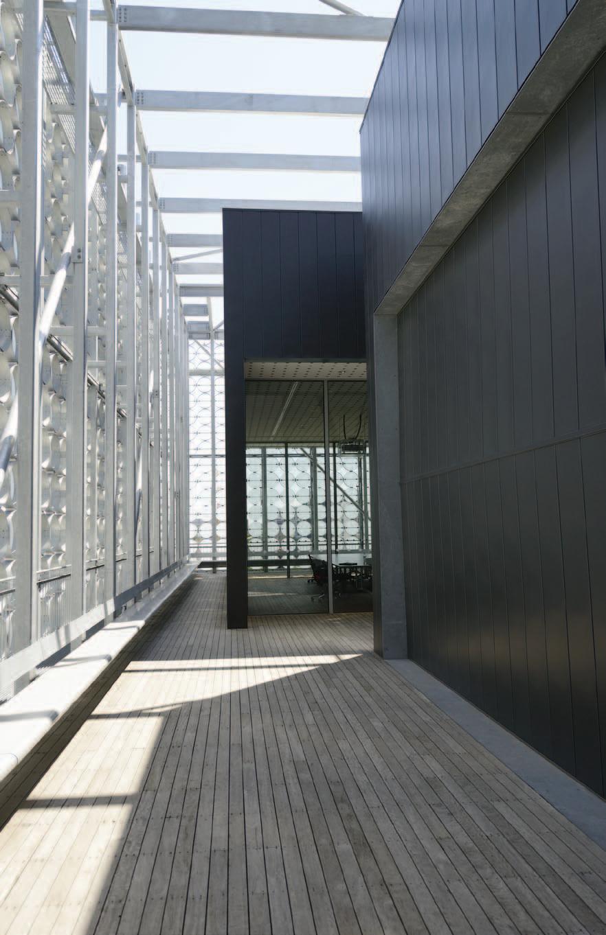 Dispersed in varying degrees of separation across the Hubs’ rooftop terrace are four seminar Pavilions that further demonstrate Godsell’s fascination with in-between spaces. Liminalities and thresholds reveal themselves between the two layers of the buildings’ skin, one pavilion and the next, and between the top storey service core and adjacent Long Room. Held somewhere between a ‘course outer layer’ and a more ‘nurturing inner space’, this is an experience of aisles and promenades, of continually being in-between.