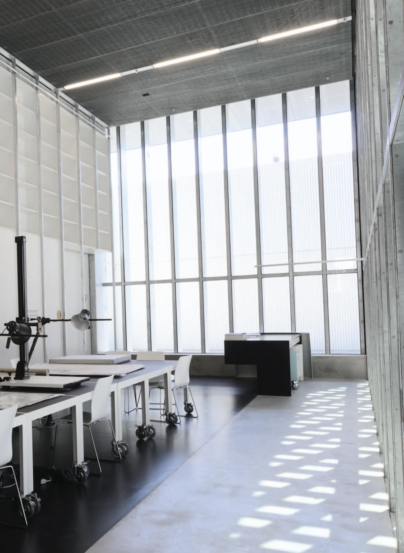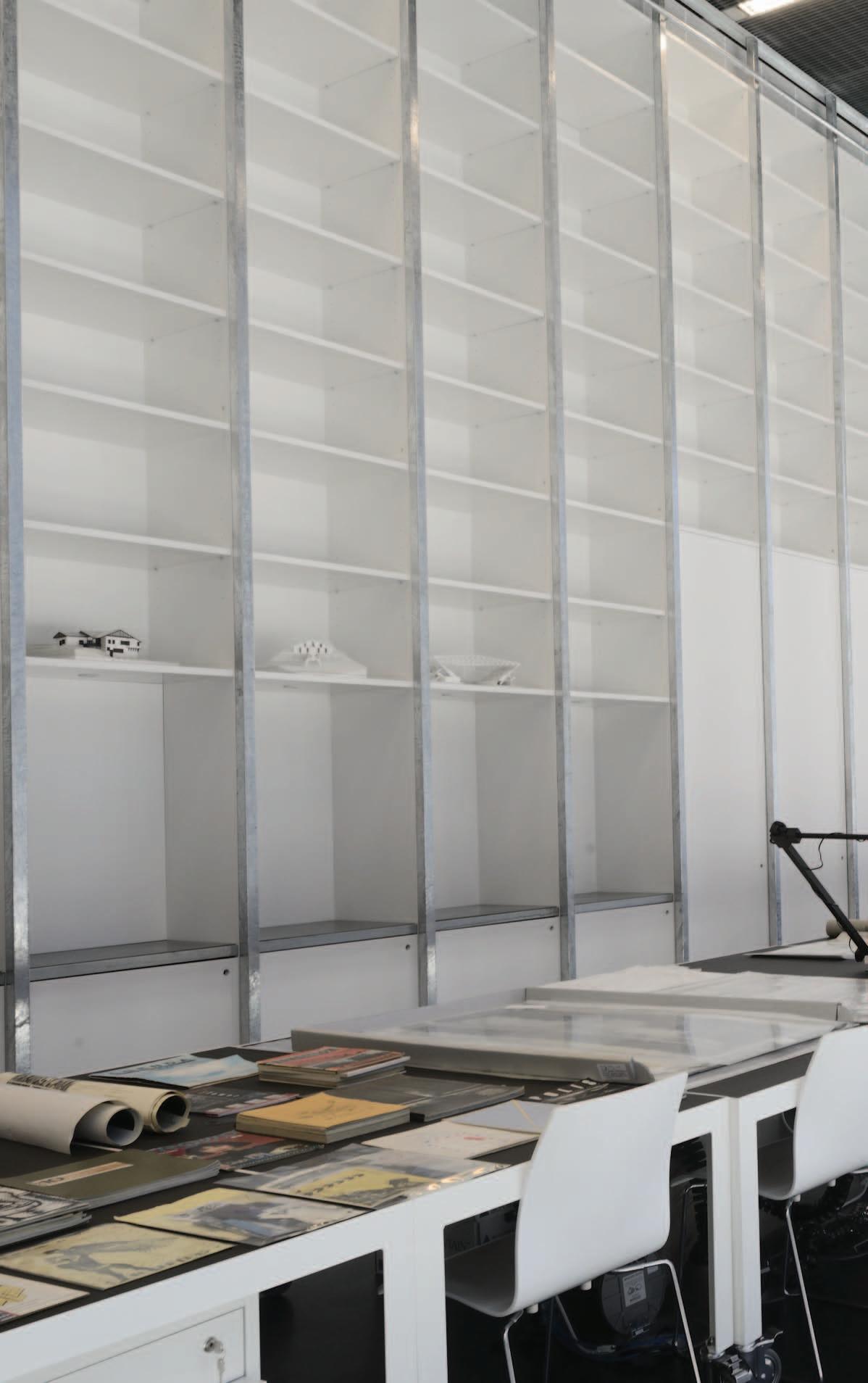 to allow for exhibitions and events. One wall supports floor-to-ceiling shelves which one day may house the growing collection of models and maquettes, while the other is glazed and looks out through a transitional liminal space to the Design Hub. Entirely bespoke, everything in this building is particular and designed.