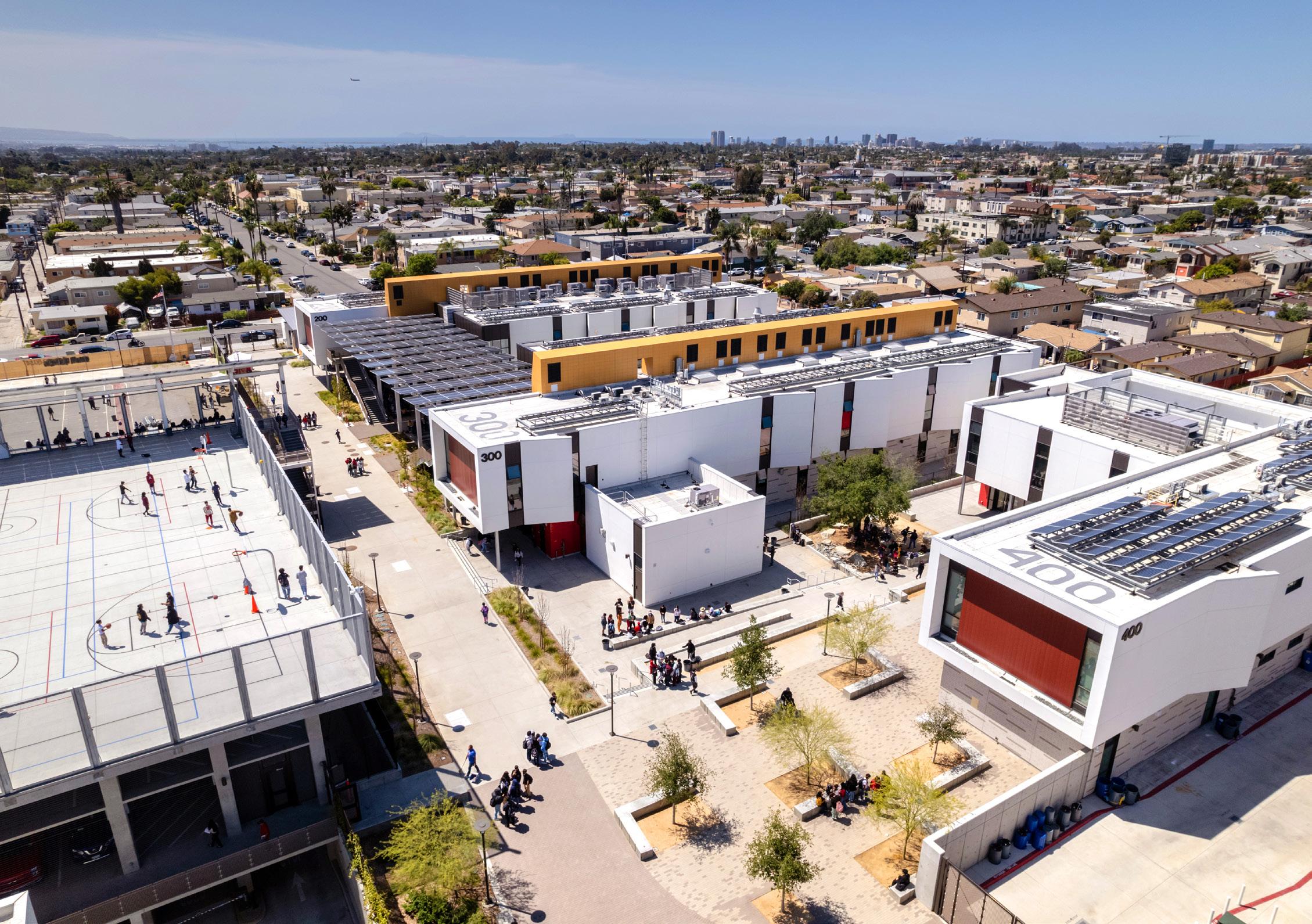 The new Wilson campus was designed as a “Community Based School” that addresses the needs of San Diego Mid City underserved neighborhoods. The two-story campus features collaborative spaces and outdoor learning venues rather than indoor circulation corridors. A large covered outdoor student commons area at the main entry is also used as an informal lunch area. The campus has after-hours community serving programs along with a City of San Diego joint use field and Performing Arts Center as a cultural / recreational center of the Mid City community.