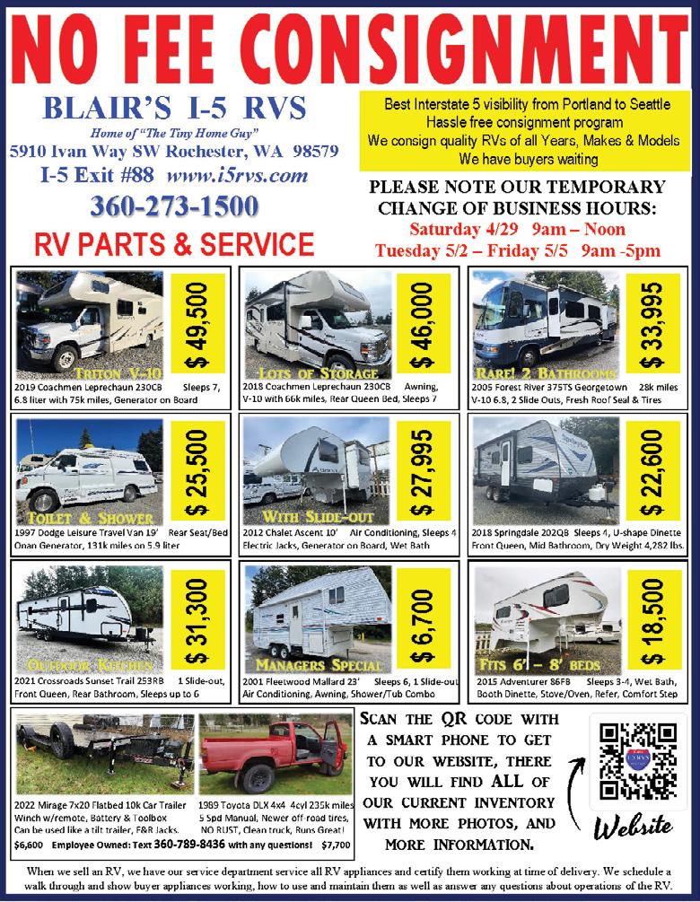360-480-6559 Olympia, WA. SALES and SERVICE RV Fifth Wheel, 2 slide outs, ONAN Gen. 3600LP 2004 Keystone Montana 2955RL Sale Price $13,500 Class C, E-350SD w/ 150k miles, AC, awning, tow package, and more. 2004 Four Winds Majestic Sale Price $13,900 2007 Okanagan 117DBL Camper Sale Price $41,500 Camper with double slide out, 2003 Ford F-350SD XL dually, V-10 w/ only 119k miles. Package priced but can be sold seperately. 2017 Keystone Montana 3810MS Sale Price $58,500 Fifth Wheel, Like new, 4 seasons package, 3 slide outs, 3 TVs (one outside), 2 fireplaces, sofa in bedroom, ceiling fan, leather, AC, stainless double door fridge, and so much more! 2015 Heartland Roadwarrior Sale Price $44,500 Toy Hauler Fifth wheel 30.5 ft, cargo 10x8’, sleeps 8, 2 queens, bunks, pullout couch, queen master, TV, fireplae, and more! 2018 Jayco Greyhawk Prestiege 30XP Sale Price $69,500 Class C motorhome, E-450SD with only 27k miles, JRide System, full wall slide with cover, AC, awning, tow package,and more. 1996 Mitsubishi Delica 17’ Sale Price $39,500 Diesel motorhome, 4x4, 5-speed