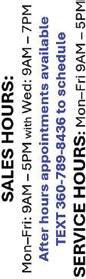 OPEN 7 Days a week! 9am to 5pm 360-330-2886 1030 S. Gold St. Centralia, WA. www.sunnyvalleyautosales.com Sunny Valley Sales Budget Truck Rentals All vehicles subject to prior sale. Vin numbers available at dealership. All prices plus negotiable documentation fee, tax, & License. HUGE INVENTORY REDUCTION SALE!!