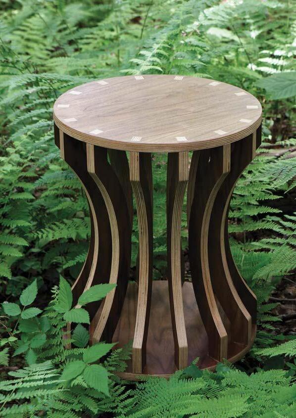 The cylindrical, hour-glass shape shape of the VAL stool is made up of a series of birch plywood slats. This piece can be either a side table or stool.