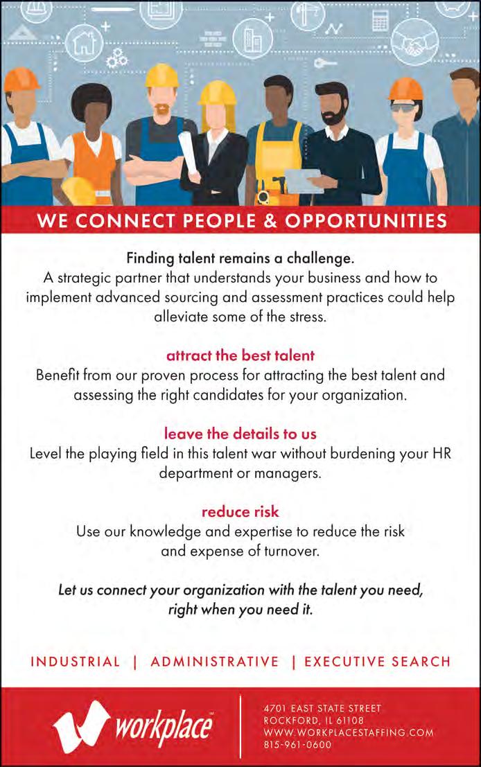 Continued from front page has an active Government Affairs Council focused on advocating for a strong and healthy business environment by influencing legislative, economic and social policy. All members of the Rockford Chamber are welcome to join the council to represent the business community’s interest by encouraging business growth, promoting a strong local economy and fostering a favorable business climate in the Rockford region.